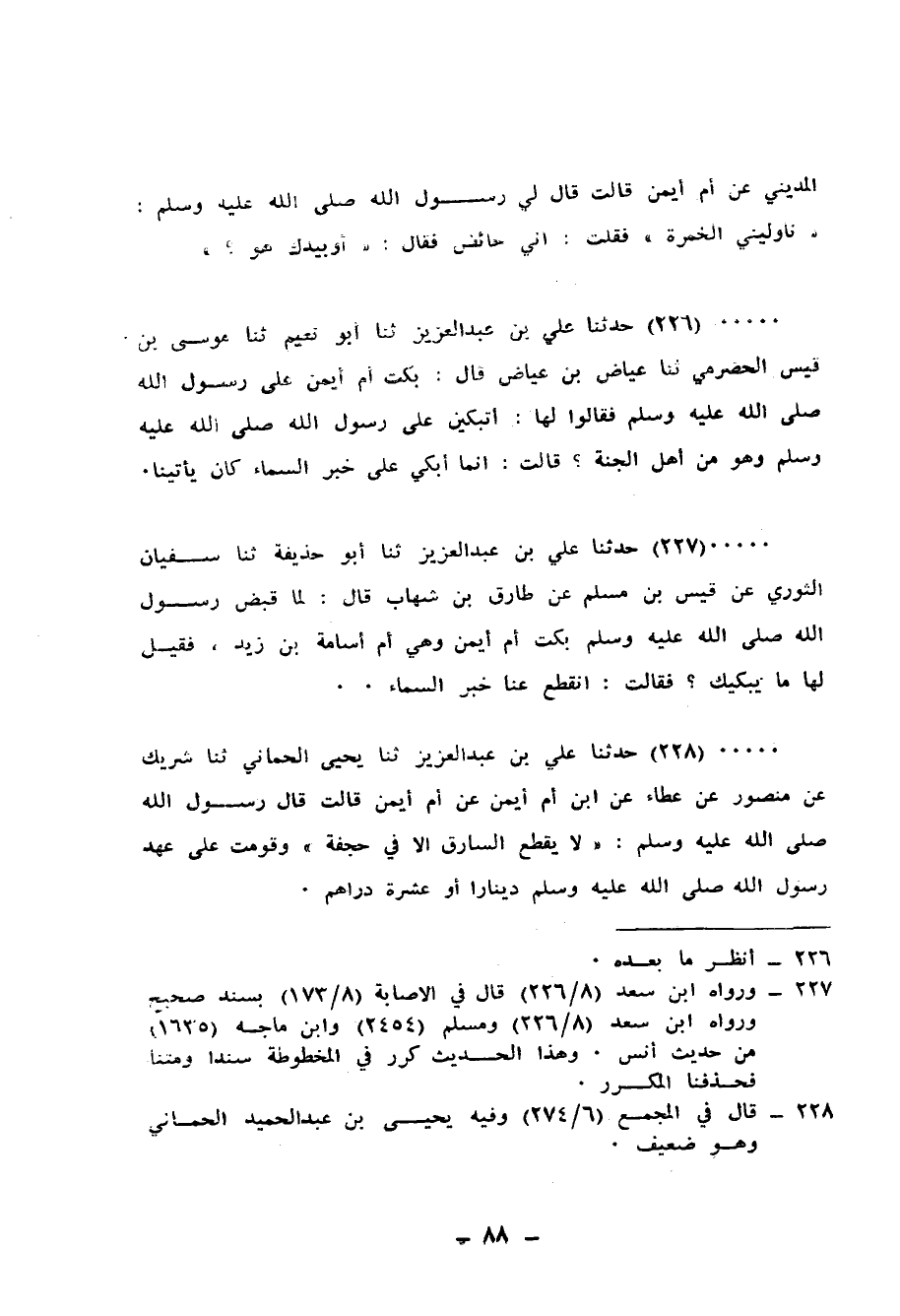 227 - حَدَّثَنَا عَلِيُّ بْنُ عَبْدِ الْعَزِيزِ، ثنا أَبُو حُذَيْفَةَ، ثنا سُفْيَانُ الثَّوْرِيُّ، عَنْ قَيْسِ بْنِ مُسْلِمَ، عَنْ طَارِقِ بْنِ شِهَابٍ، قَالَ: لَمَّا قُبِضَ رَسُولُ اللهِ صَلَّى اللهُ عَلَيْهِ وَسَلَّمَ بَكَتْ أُمُّ أَيْمَنَ وَهِيَ أُمُّ أُسَامَةَ بْنِ زَيْدٍ فَقِيلَ لَهَا: مَا يُبْكِيكَ؟ فَقَالَتْ: «§انْقَطَعَ عَنَّا خَبَرُ السَّمَاءِ»