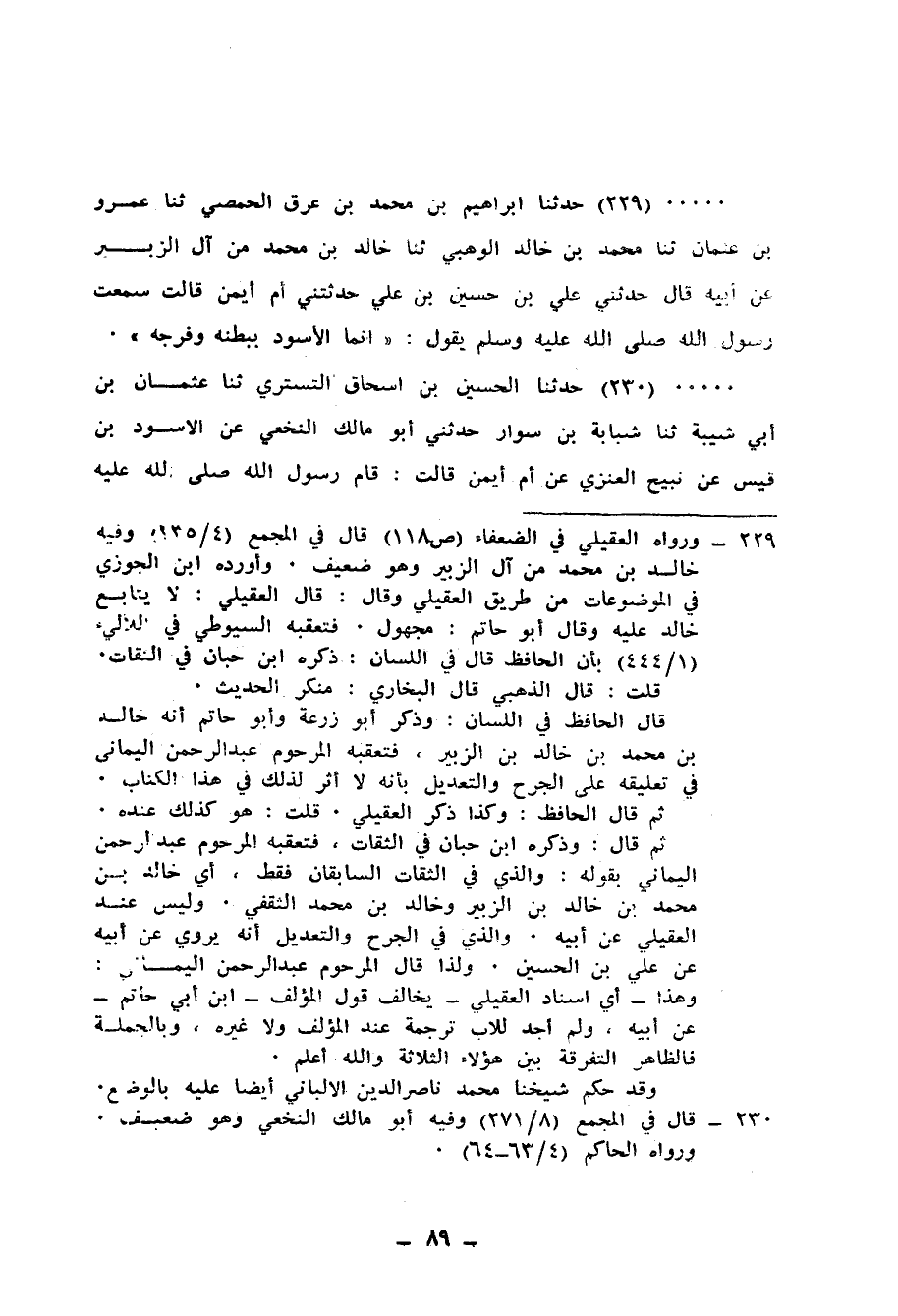 229 - حَدَّثَنَا إِبْرَاهِيمُ بْنُ مُحَمَّدِ بْنِ عِرْقٍ الْحِمْصِيُّ، ثنا عَمْرُو بْنُ عُثْمَانَ، ثنا مُحَمَّدُ بْنُ خَالِدٍ الْوَهْبِيُّ، ثنا خَالِدُ بْنُ مُحَمَّدٍ، مِنْ آلِ الزُّبَيْرِ عَنْ أَبِيهِ، قَالَ: حَدَّثَنِي عَلِيُّ بْنُ حُسَيْنِ بْنِ عَلِيٍّ، حَدَّثَتْنِي أُمُّ أَيْمَنَ، قَالَتْ: سَمِعْتُ رَسُولَ اللهِ صَلَّى اللهُ عَلَيْهِ وَسَلَّمَ، يَقُولُ: «§إِنَّمَا الْأَسْوَدُ بِبَطْنِهِ وَفَرْجَهِ»