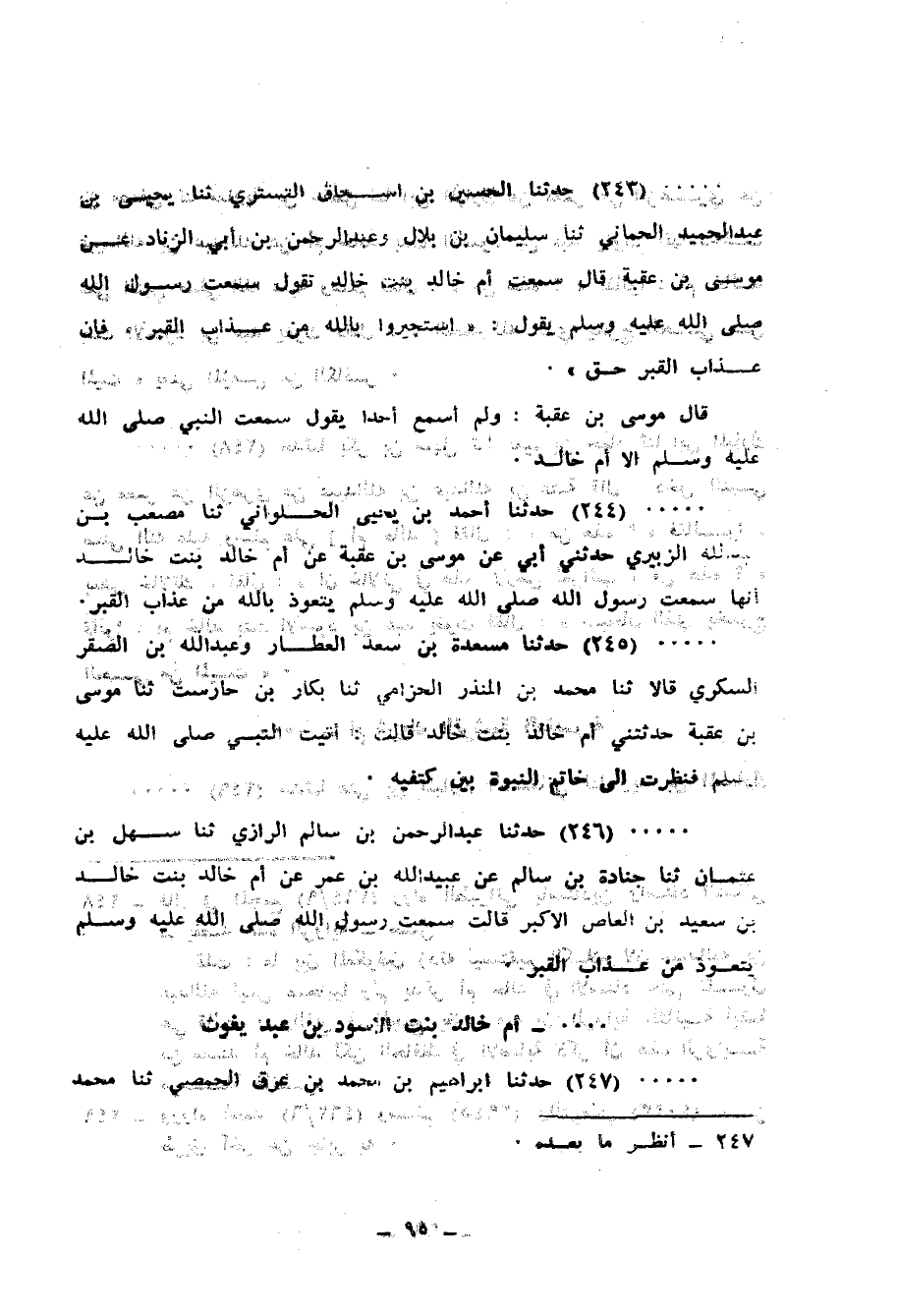 244 - حَدَّثَنَا أَحْمَدُ بْنُ يَحْيَى الْحُلْوَانِيُّ، ثنا مُصْعَبُ بْنُ عَبْدِ اللهِ الزُّبَيْرِيُّ، حَدَّثَنِي أَبِي، عَنْ مُوسَى بْنِ عُقْبَةَ، عَنْ أُمِّ خَالِدٍ بِنْتِ خَالِدٍ، أَنَّهَا: «سَمِعَتْ رَسُولَ اللهِ صَلَّى اللهُ عَلَيْهِ وَسَلَّمَ §يَتَعَوَّذُ بِاللهِ مِنْ عَذَابِ الْقَبْرِ»