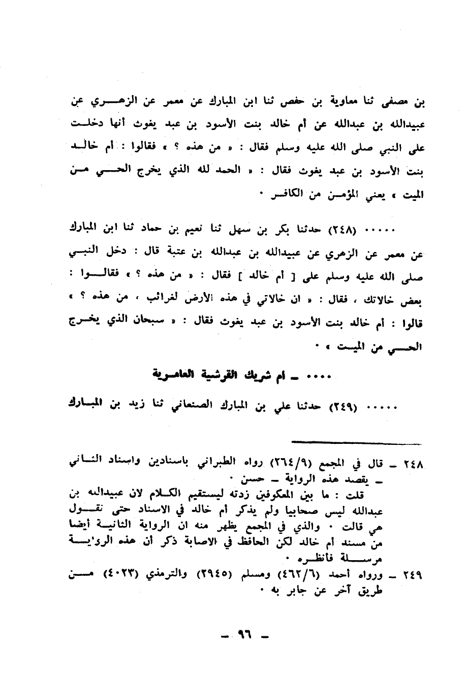 248 - حَدَّثَنَا بَكْرُ بْنُ سَهْلٍ، ثنا نُعَيْمُ بْنُ حَمَّادٍ، ثنا ابْنُ الْمُبَارَكِ، عَنْ مَعْمَرٍ، عَنِ الزُّهْرِيِّ، عَنْ عُبَيْدِ اللهِ بْنِ عَبْدِ اللهِ بْنِ عُتْبَةَ، قَالَ: دَخَلَ النَّبِيُّ صَلَّى اللهُ عَلَيْهِ وَسَلَّمَ عَلَى أُمِّ خَالِدٍ فَقَالَ: مَنْ هَذِهِ؟ فَقَالُوا: بَعْضُ خَالَاتِكِ، فَقَالَ: إِنَّ خالِاتي فِي هَذِهِ الْأَرْضِ لَغَرَائِبُ مِنْ هَذِهِ، قَالُوا: أُمُّ خَالِدٍ بِنْتُ الْأَسْوَدِ بْنِ عَبْدِ يَغُوثَ، فَقَالَ: «§سُبْحَانَ الَّذِي يُخْرِجُ الْحَيَّ مِنَ الْمَيِّتِ»