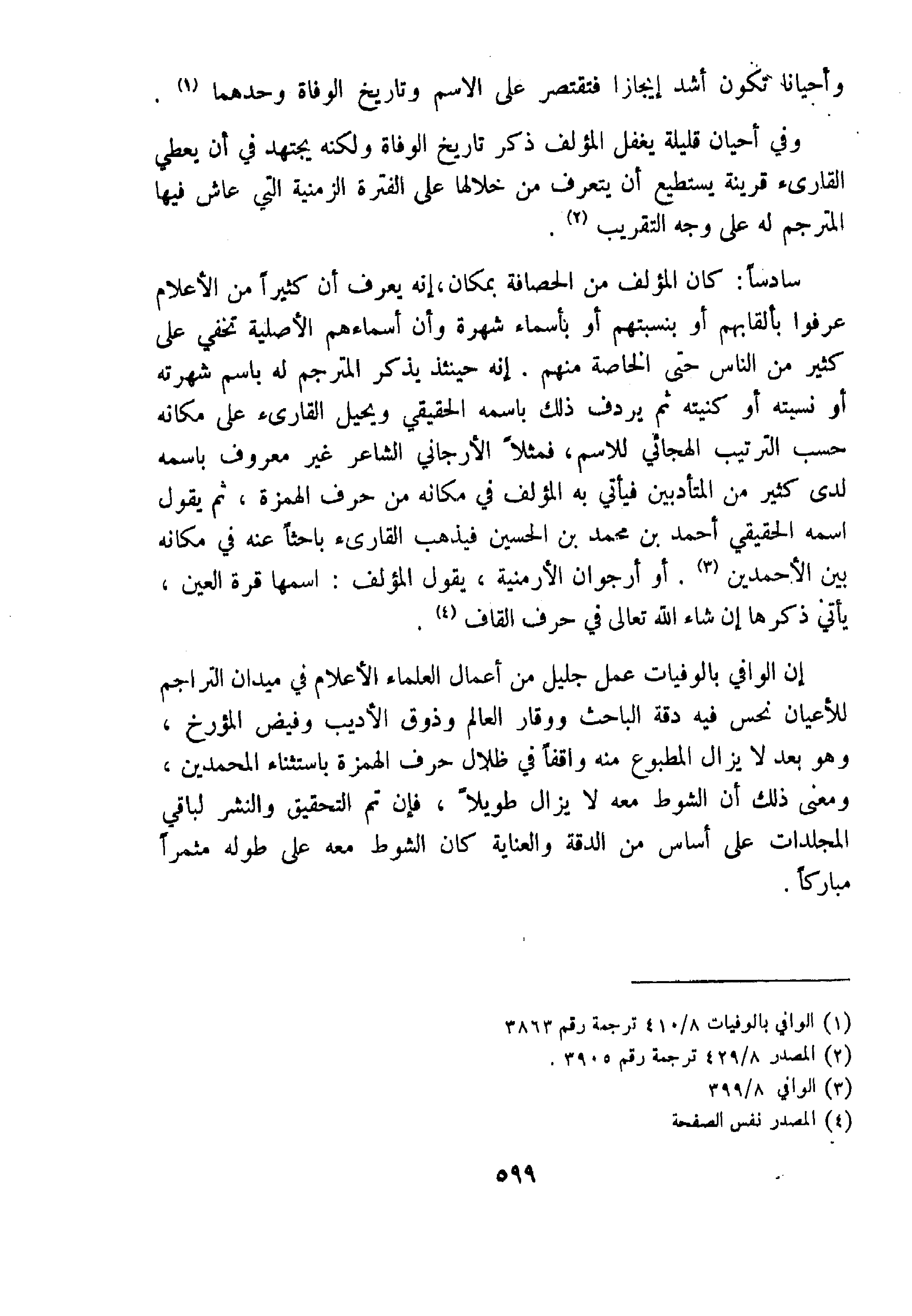 ليس هذا على كل حال موضوعنا فربما كان دافعي إلى ذكر هذه الطرفة هو شيء من الترويح عن النفس، وإنما الذي يهمنا أن صلاح الدين الصفدي، قد قرأ كتاب وفيات الأعيان لابن خلكان -وهو أكثر موسوعات التراجم دقة وثقة- ورأى أن يستدرك ما فات ابن خلكان وأن يغطي الفترة الزمنية التي فصلت بينهما فأنشأ موسوعته النفيسة "الوافي بالوفيات" التي لم يطبع منها لسوء الحظ -حسبما ذكرنا في الباب الماضي- إلا أجزاء ثمانية حتى كتابة هذه الأسطر، وتقوم على نشرها الآن في فسبادن بألمانيا هيئة من المهتمين بنشر التراث العربي.