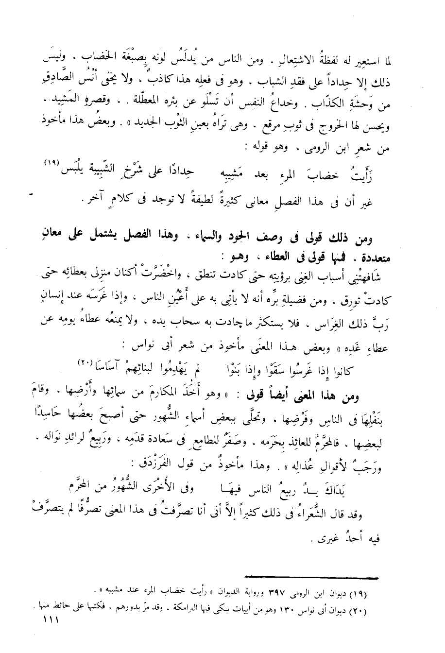 لما استعير له لفظة الاشتعال، ومن الناس من يدلِّس لونه بصبغة الخضاب، وليس ذلك إلّا حدادًا على فقد الشباب، وهو في فعله هذا كاذب, ولا يخفى أنس الصادق من وحشة الكذاب، وخداع النفس أن تسلو عن بئره المعطَّلة, وقصره المشيد، ويحسن لها الخروج في ثوب مرقَّع, وهي تراه بعين الثوب الجديد. وبعض هذا مأخوذ من شعر ابن الرومي، وهو قوله: