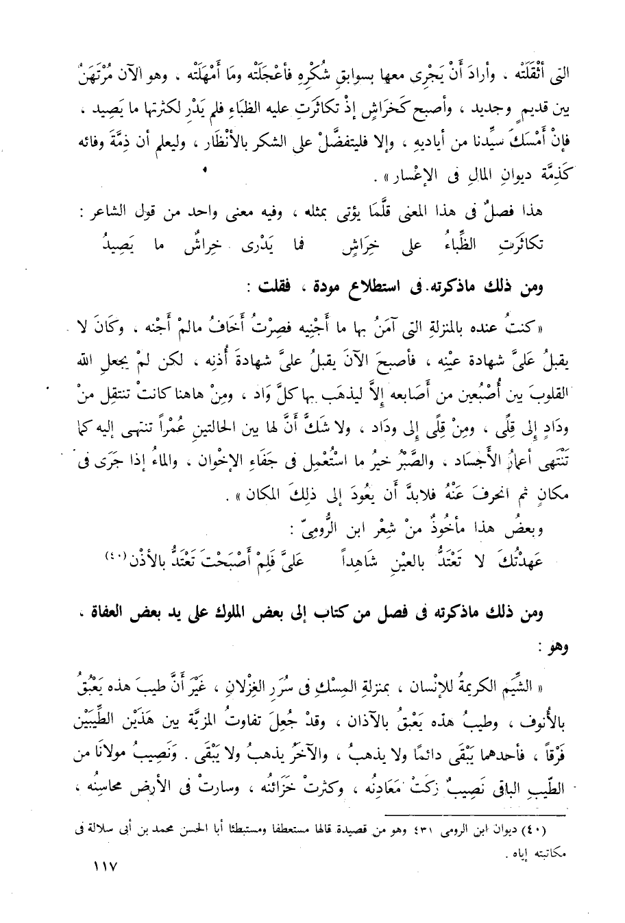 1 ديوان ابن الرومي 431 وهو من قصيدة قالها مستعطفًا ومستبطئًا أبا الحسن محمد بن أبي سلالة في مكاتبته إياه.