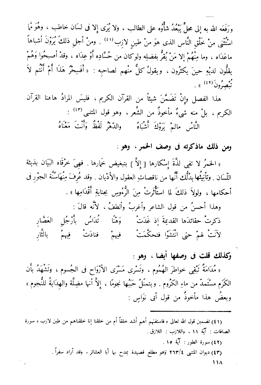 هذا الفصل وإن تضمَّن شيئًا من القرآن الكريم فليس المراد ههنا القرآن الكريم، بل منه شيء مأخوذ من الشعر، وهو قول المتنبي3: