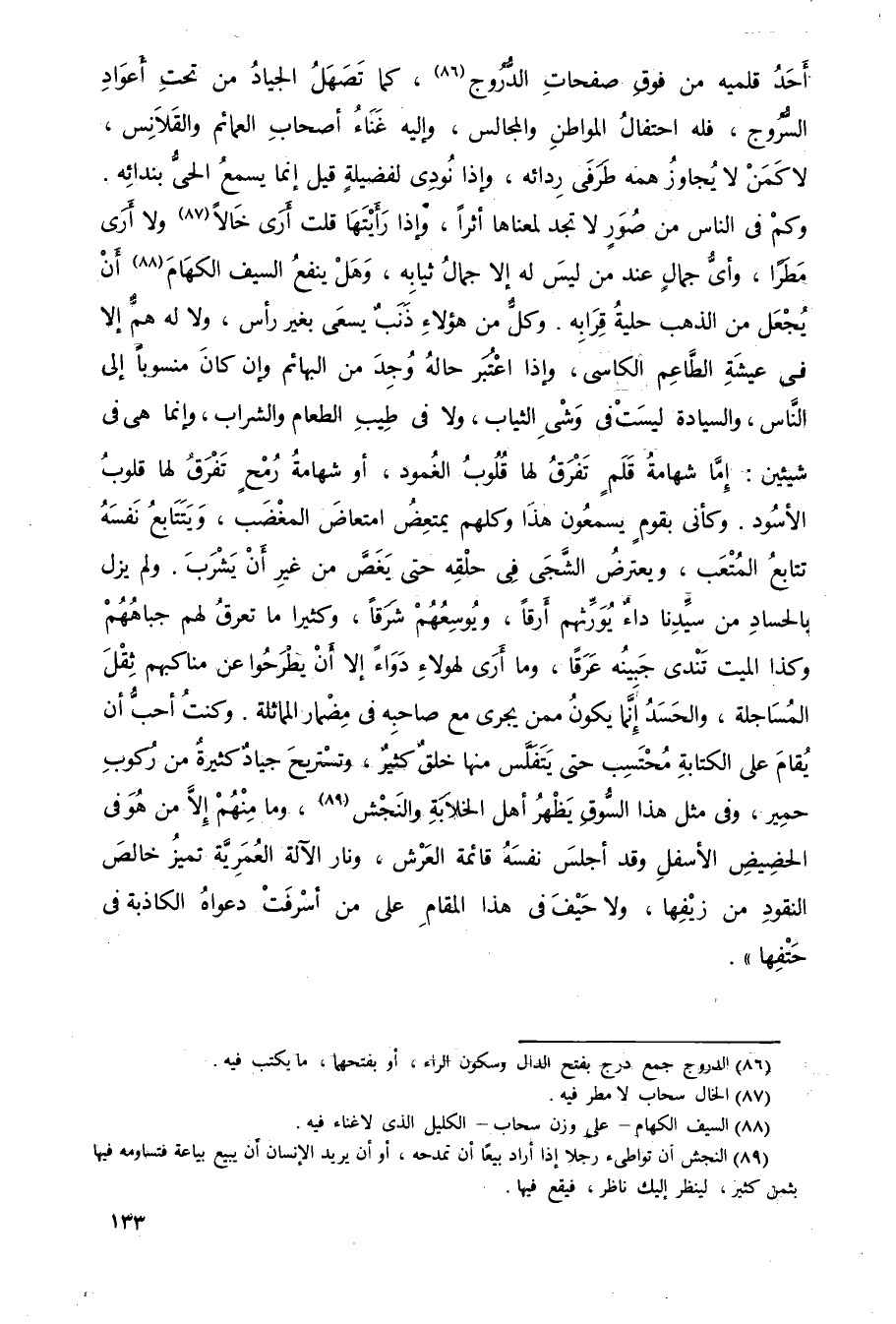 أحد قلميه من فوق صفحات الدُّرُوج1، كما تصهل الجياد من تحت أعواد السروج، فله احتفال المواطن والمجالس، وإليه غناء أصحاب العمائم والقلانس، لا كمن لا يجاوز همه طرفي ردائه، وإذا نودي لفضيلة قيل: إنما يسمع الحي بندائه، وكم في الناس من صور لا تجد لمعناها أثرًا، وإذا رأيتها قلت أرى خالًا2 ولا أرى مطرًا، وأي جمال عند من ليس له إلا جمال ثيابه، وهل ينفع السيف الكهام3 أن تجعل من الذهب حيلة قرابه، وكل من هؤلاء ذنبٌ يسعى بغير رأس، ولا له همٌّ إلا في عيشة الطاعم الكاسي, وإذا اعتبر حاله وجد من البهائم وإن كان من منسوبًا إلى الناس، والسيادة ليست في وشي الثياب، ولا في طيب الطعام والشراب، وإنما هي في شيئين: إما شهامة قَلَمٍ تفرق لها قلوب الغمود، أو شهامة رمح تفرق لها قلوب الأسود، وكأنِّي بقوم يسمعون هذا وكلهم يمتعض امتعاض المغضب، وتتابع نفسه تتابع المتعب، ويعترض الشجي في حلقه حتى يغص من غير أن يشرب، ولم يزل بالحساد من سيدنا داءٌ يورثهم أرقًا، ويُوسِعُهم شرقًا، وكثيرًا ما تعرق له جباههم, وكذا الميت يندى جبينه عرقًا، وما أرى لهؤلاء دواء إلا أن يطرحوا عن مناكبهم ثقل المساجلة، والحسد إنما يكون ممن يجري مع صاحبه في مضمار المماثلة، وكنت أحبّ أن يقام على الكتابة محتسب حتى يتفلَّس منها خلق كثير، وتستريح جياد كثيرة من ركوب حمير، وفي مثل هذا السوق يظهر أهل الخلابة والنجش4، وما منهم إلا من هو في الحضيض الأسفل وقد أجلس نفسه قائمة العرش، ونار الآلة العمرية تميز خالص النقود من زيفها، ولا حيف في هذا المقام على من أسرفت دعواه الكاذبة في حتفها".