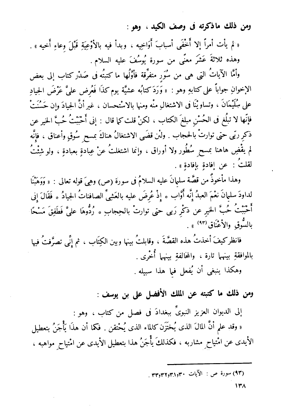 وأما الآيات التي هي من سور متفرقة, فأولها ما كتبته في صدر كتاب إلى بعض الإخوان جوابًا عن كتابه، وهو: "ورد كتابه عشية يوم كذا فعرض علي عرض الجياد على سليمان، وتساوينا في الاشتغال منه ومنها بالاستحسان، غير أن الجياد وإن حسنت فإنها لا تبلغ في الحسن مبلغ الكتاب، لكن قلت كما قال: إني أحببت حب الخير عن ذكر ربي حتى توارت بالحجاب، ولئن قضي الاشتغال هناك بمسح سوقٍ وأعناق، فإنه لم يقض ههنا بمسح سطور ولا أوراق، وإنما اشتغلت عن عبادة بعبادة، ولو شئت لقلت: عن إفادة بإفادة".