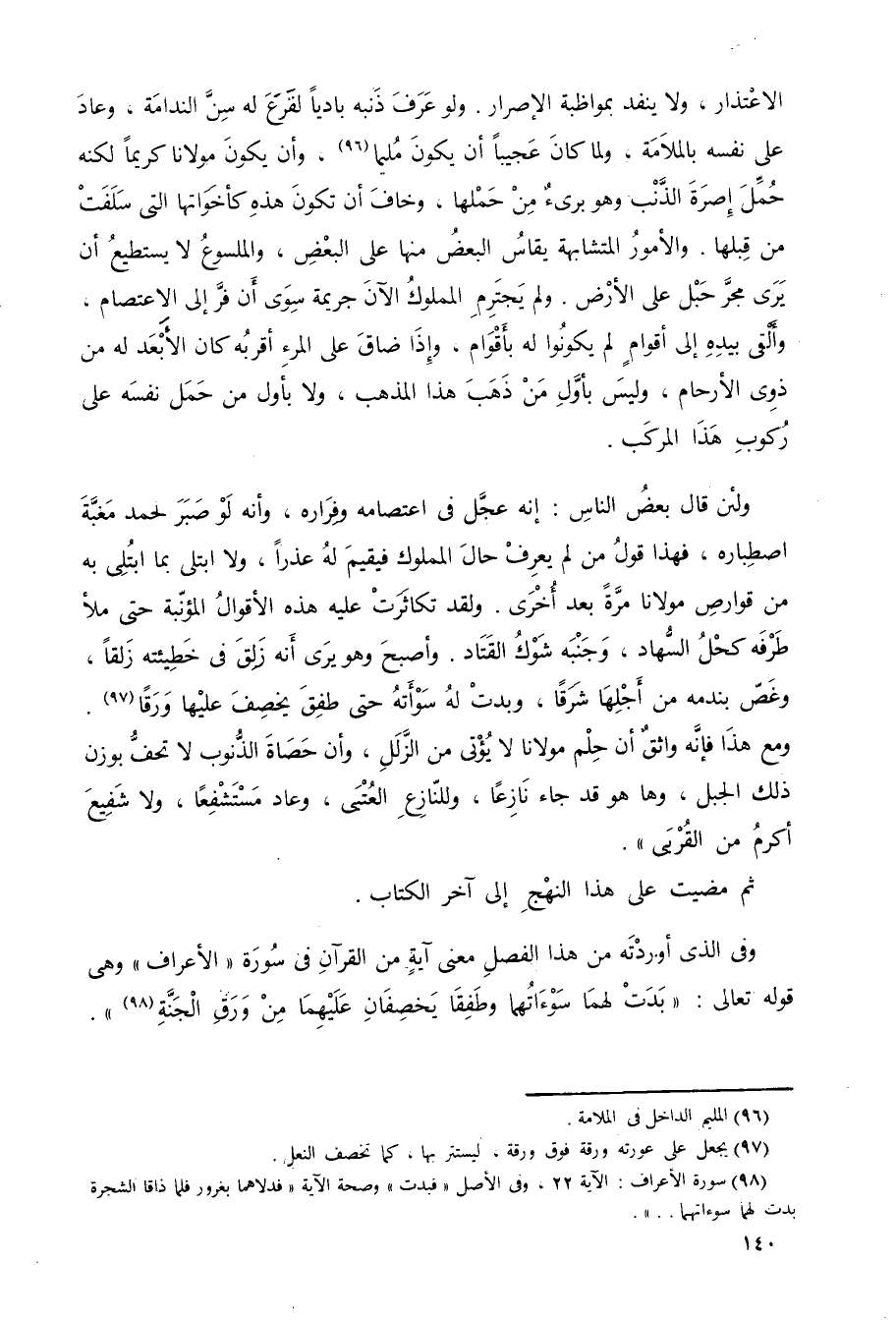 ولئن قال بعض الناس: إنه عجَّل في اعتصامه وفراره، وإنه لو صبر لحمد مغبة اصطباره, فهذا قول من لم يعرف حال الملوك فيقيم له عذرًا, ولا ابتلي بما ابتُليِ به من قوارص مولانا مرة بعد أخرى، ولقد تكاثرت عليه هذه الأقوال المؤنّبة حتى ملأت طرفه كحل السُّهاد، وجنبه شوك القتاد، وأصبح وهو يرى أنه زلق في خطيئته زلقًا، وغصَّ بندمه من أجلها شرقًا، وبدت له سوأته حتى طفق يخصف عليها ورقًا2، ومع هذا فإنه واثقٌ أن حلم مولانا لا يؤتى من الزلل، وأن حصاة الذنوب لا تَخِفّ بوزن ذلك الجبل، وها هو جاء نازعًا, وللنَّازع العتبى، وعاد مستشفعًا, ولا شفيع أكرم من القربى".