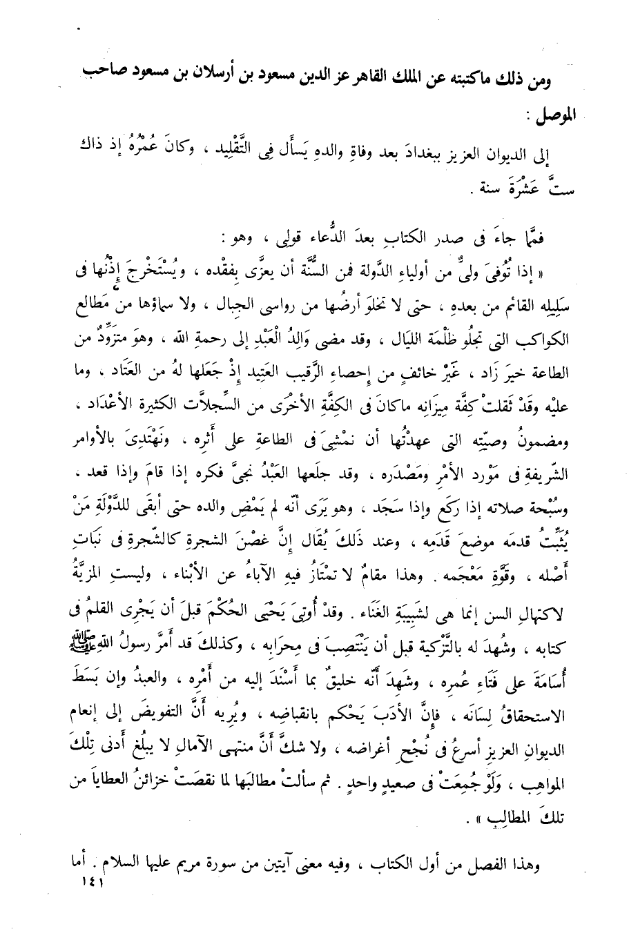 "إذا تُوفِّي وليٌّ من أولياء الدولة فمن السُّنَّة أن يعزَّى بفقده، ويستَخْرَج إذنُها في سليله القائم من بعده، حتى لا تخلو أرضها من رواسي الجبال، ولا سماؤها من مطالع الكواكب التي تجلو ظلمة الليال، وقد مضى والد العبد إلى رحمة الله, وهو متزود من الطاعة خير زاد، غير خائف من إحصاء الرقيب والعتيد إذ جعلها له من العتاد، وما عليه وقد ثقلت كفة ميزانه ما كان في الكفة الأخرى من السجلات الكثيرة الأعداد، ومضمون وصيته التي عهدتها أن نمشي في الطاعة على أثره، ونهتدي بالأوامر الشريفة في مورد الأمر ومصدره، وقد جعلها العبد نجيَّ فكره إذا قام وإذا قعد، وسُبْحَة صلاته إذا ركع وإذا سجد، وهو يرى أنه لم يمض والده حتى أبقى للدولة من يثبِّت قدمه موضع قدمه، وعند ذلك يقال: إن غصن الشجرة كالشجرة في نبات أصله, وقوة معجمه، وهذا مقام لا تمتاز فيه الآباء عن الأبناء، وليست المزية لاكتهال السن إنما هي لشبيبة الغناء، وقد أوتي يحيى الحُكْمَ قبل أن يجري القلم في كتابه، وشهد له بالتزكية قبل أن ينتصب في محرابه، وكذلك قد أمر رسول الله -صلى الله عليه وسلم- أسامة على فتاء عمره، وشهد أنه خليق بما أسند إليه من أمره، والعبد وإن بسط الاستحقاق لسانه, فإنه الأدب يحكم بانقباضه، ويريه أن التفويض إلى إنعام الديوان العزيز أسرع في نجح أغراضه، ولا شك أن منتهى الآمال لا يبلغ أدنى تلك المواهب، ولو جمعت في صعيدٍ واحد, ثم سألت مطالبها لما نقصت خزائن العطايا من تلك المطالب".