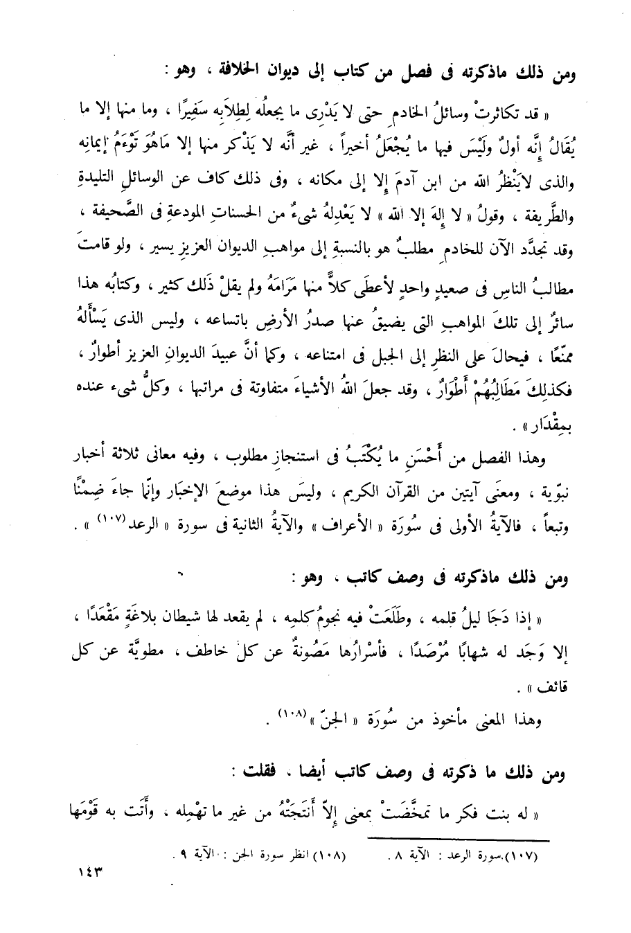 "إذا دجا ليل قلمه، وطلعت فيه نجوم كلمه، لم يقعد لها شيطان بلاغة مقعدًا، إلا وجد له شهابًا مُرْصَدًا، فأسرارها مصونة عن كل خاطف، مطوية عن كل قائف".