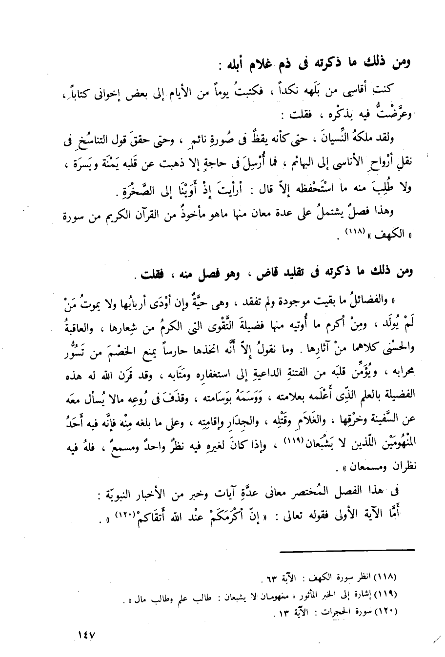 "والفضائل ما بقيت موجودةٌ ولم تفقد، وهي حية وإن أودى أربابها، ولا يموت من لم يولد، ومن أكرم ما أوتيه منها فضيلة التقوى التي الكرم من شعارها، والعاقبة والحسنى كلاهما من آثارها، وما نقول إلا أنه اتخذها حارسًا يمنع الخصم من تسوّر محرابه، ويؤمن قلبه من الفتنة الداعية إلى استغفاره ومتابه، وقد قرن الله له هذه الفضيلة بالعلم الذي أعلمه بعلامته، ووسمه بوسامته، وقذف في روعه ما لا يسأل معه عن السفينة وخرقها, والغلام وقتله, والجدار وإقامته، وعلى ما بلغه منه فإنه فيه أحد المنهومين اللذين لا يشبعان2، وإذا كان لغيره فيه نظر واحد ومسمع, فله فيه نظران ومسمعان".