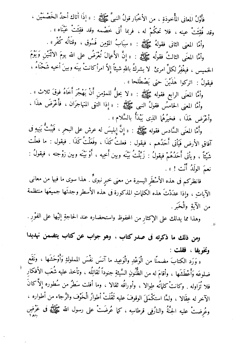 فانظر كم في هذه الأسطر اليسيرة من معنى خبر نبوي، هذا سوى ما فيها من معاني الآيات، وإذا عددت هذه الكلمات المذكورة في هذه الأسطر وجدتها جميعًا منتظمة من الآية والخبر.