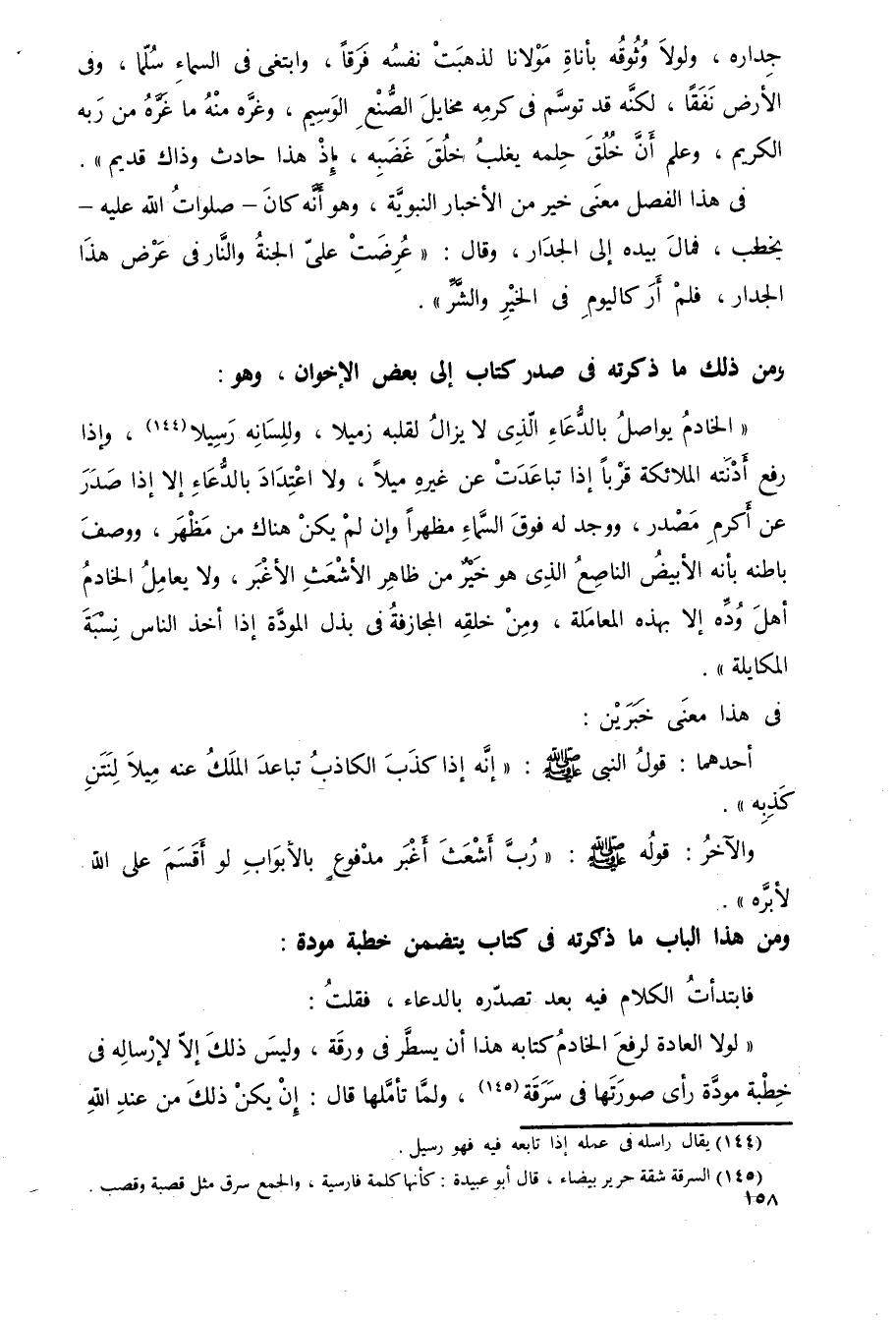 "لولا العادة لرفع الخادم كتابه هذا أن يسطَّر في ورقة، وليس ذلك إلا لإرساله في خطبة مودة رأى صورتها في سرقة2، ولما تأمَّلَها قال: إن يكن ذلك من عند الله