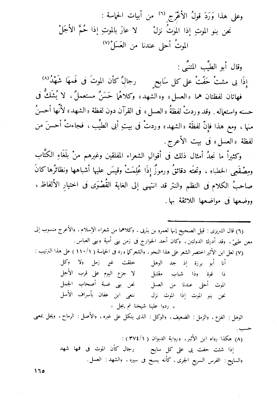 فهاتان لفظتان هما "العسل" و"الشهد"، وكلاهما حسن مستعمل, لا يُشَكُّ في حسنه واستعماله، وقد وردت لفظة "العسل" في القرآن، دون لفظة "الشهد"، لأنها أحسن منها، ومع هذا, فإن لفظة "الشهد" وردت في بيت أبي الطيب فجاءت أحسن من لفظة "العسل" في بيت الأعرج.