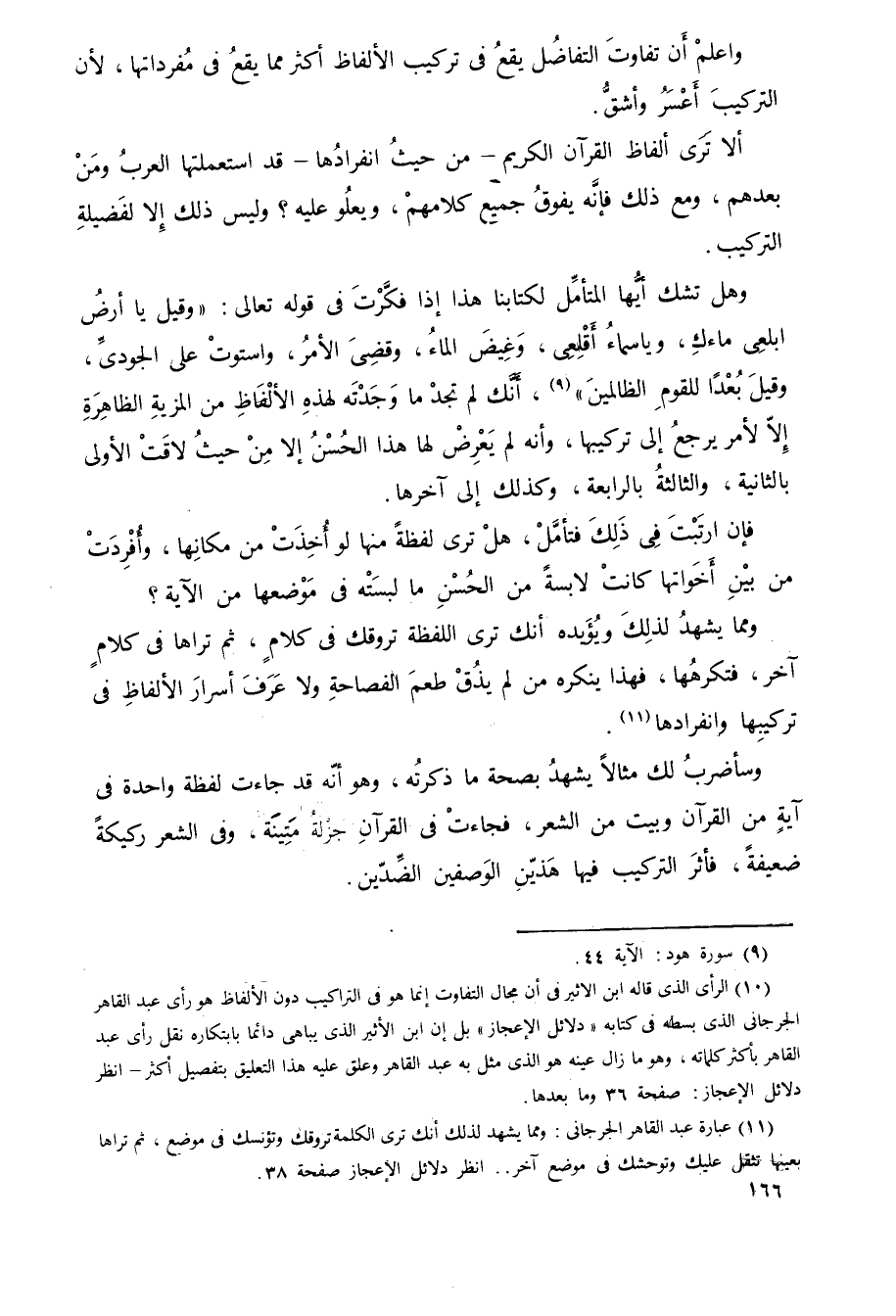 وهل تشك أيها المتأمّل لكتابنا هذا إذا فكَّرت في قوله تعالى: {وَقِيلَ يَا أَرْضُ ابْلَعِي مَاءَكِ وَيَا سَمَاءُ أَقْلِعِي وَغِيضَ الْمَاءُ وَقُضِيَ الْأَمْرُ وَاسْتَوَتْ عَلَى الْجُودِيِّ وَقِيلَ بُعْدًا لِلْقَوْمِ الظَّالِمِينَ} 1، أنك لم تجد ما وجدته لهذه الألفاظ من المزيّة الظاهرة إلا لأمر يرجع إلى تركيبها، وأنه لم يعرض لها هذا الحسن إلّا من حيث لاقت الأولى بالثانية، والثالثة بالرابعة، وكذلك إلى آخرها2.