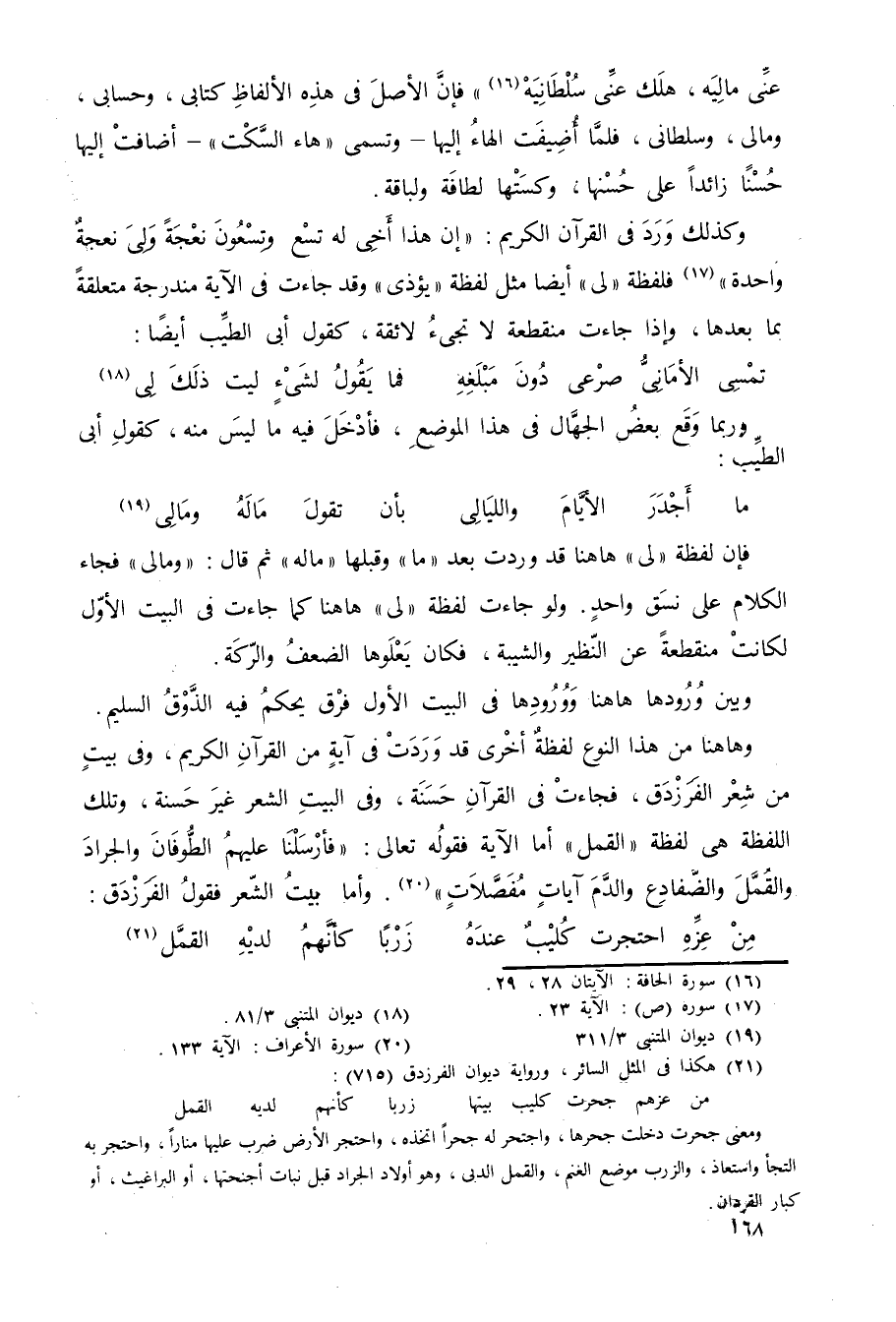 وكذلك ورد في القرآن الكريم: {إِنَّ هَذَا أَخِي لَهُ تِسْعٌ وَتِسْعُونَ نَعْجَةً وَلِيَ نَعْجَةٌ وَاحِدَةٌ} 2 فلفظة "لي" أيضًا مثل لفظة "يؤذي" وقد جاءت في الآية مندرجة متعلقة بما بعدها، وإذا جاءت منقطعة لا تجيء لائقة، كقول أبي الطيب أيضًا: