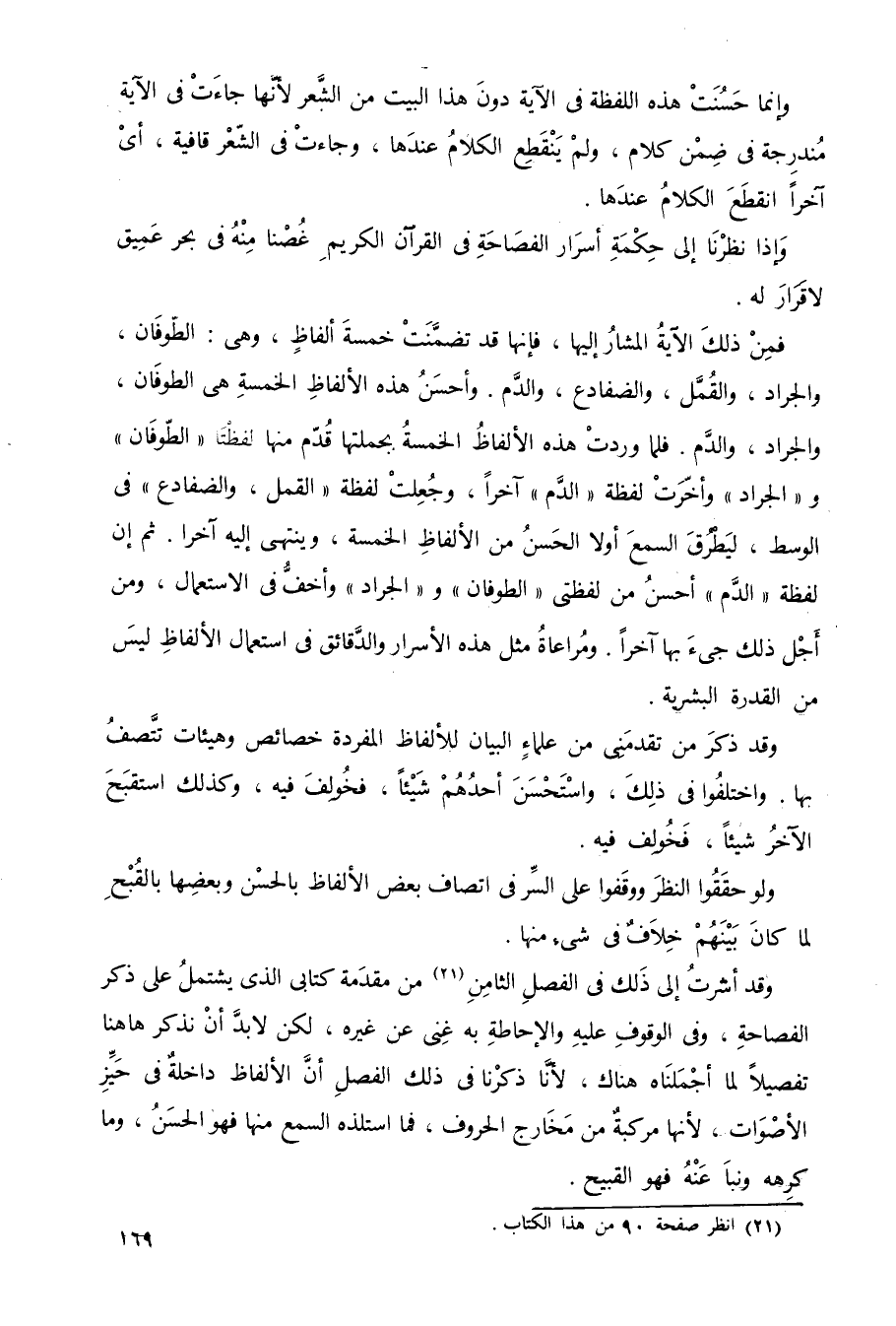 فمن ذلك هذه الآية المشار إليها، فإنها قد تضمَّنت خمسة ألفاظ، وهي: الطوفان، والجراد، والقمَّل، والضفادع، والدم، وأحسن هذه الألفاظ الخمسة هي الطوفان والجراد والدم، فلمَّا وردت هذه الألفاظ الخمسة بجملتها قُدِّمَ منها لفظتا "الطوفان" و"الجراد"، وأُخِّرَت لفظة "الدم" آخرًا، وجعلت لفظة "القمل والضفادع" في الوسط، ليطرق السمع أولًا الحسن من الألفاظ الخمسة, وينتهي إليه آخرًا، ثم إن لفظة "الدم" أحسن من لفظتي "الطوفان" و"الجراد"، وأخف في الاستعمال، ومن أجل ذلك جيء بها آخرًا، ومراعاة مثل هذه الأسرار والدقائق في استعمال الألفاظ ليس من القدرة البشرية.