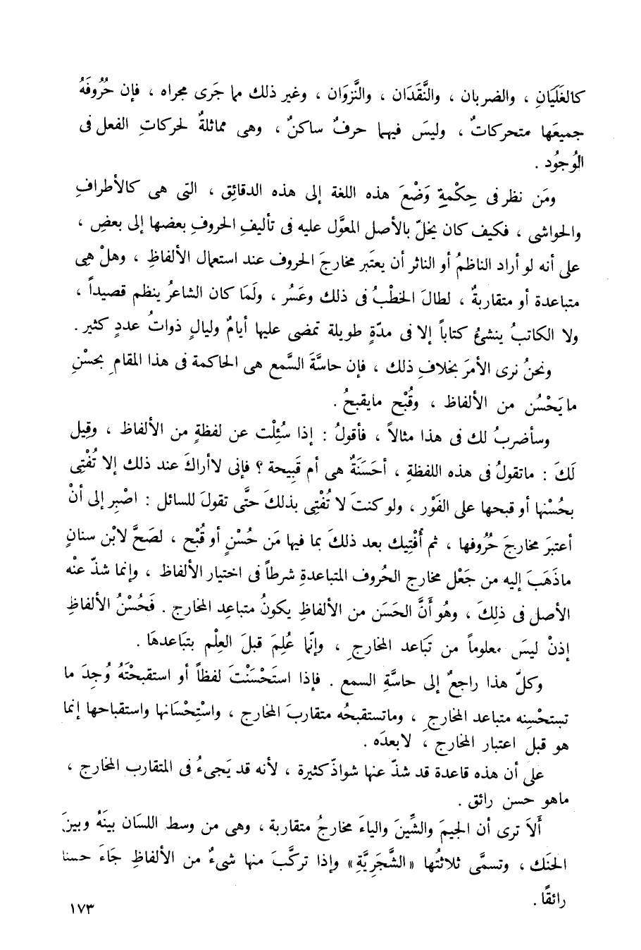 ومن نظر في حكمة وضع اللغة إلى هذه الدقائق, التي هي كالأطراف والحواشي, فكيف كان يخل بالأصل المعوَّل عليه في تأليف الحروف بعضها إلى بعض? على أنه لو أراد الناظم أو الناظر أن يعتبر مخارج الحروف عند استعمال الألفاظ, وهل هي متباعدة أو متقاربة, لطال الخطب في ذلك وعَسُرَ، وما كان الشاعر ينظم قصيدًا, ولا الكاتب ينشئ كتابًا, إلا في مدة طويلة تمضي عليها أيام وليال ذوات عدد كثير.