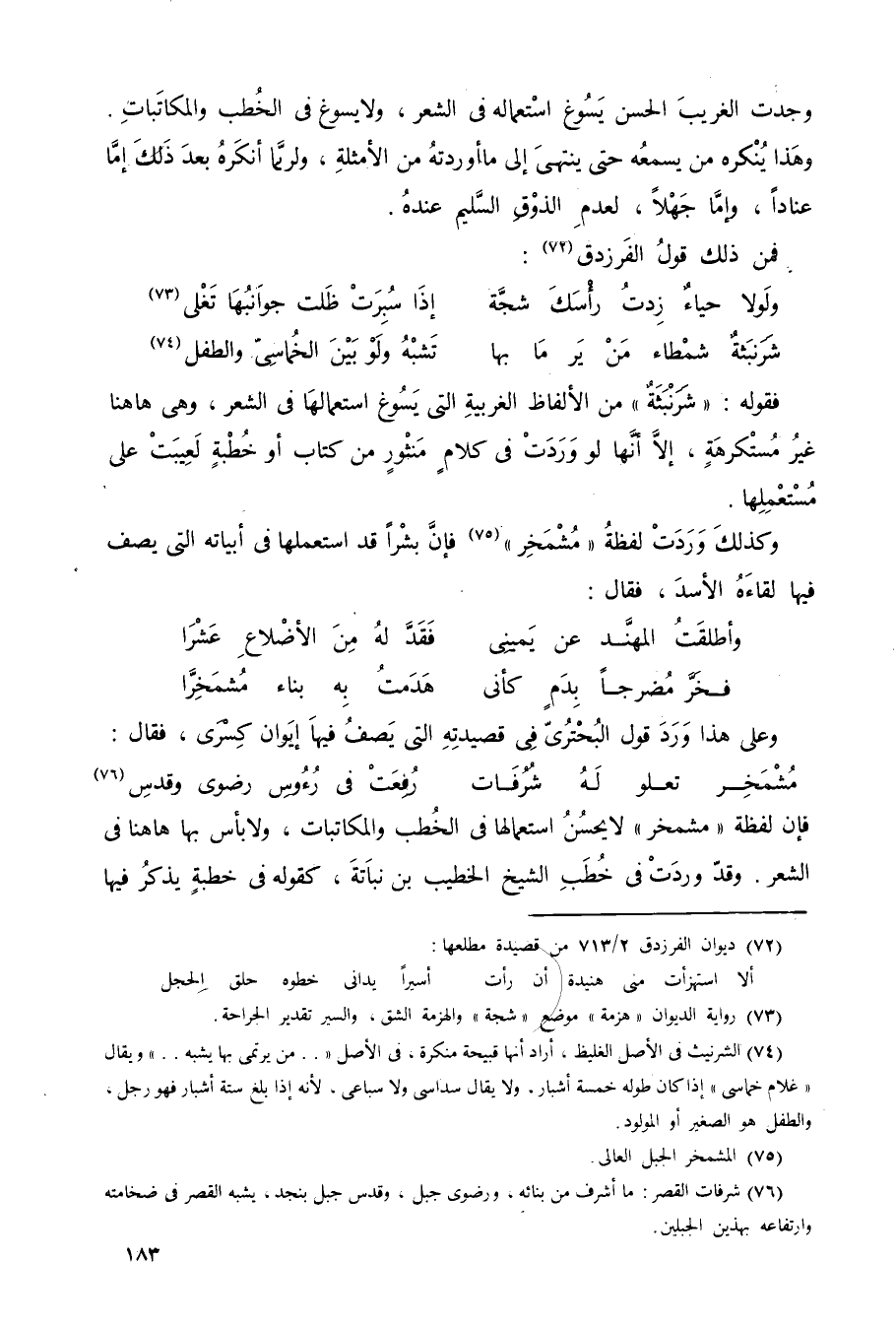 فإن لفظة "مشمخر" لا يحسن استعمالها في الخطب والمكاتبات، ولا بأس بها ههنا في الشعر، وقد وردت في خطب الشيخ الخطيب ابن نباتة، كقوله في خطبة يذكر فيها