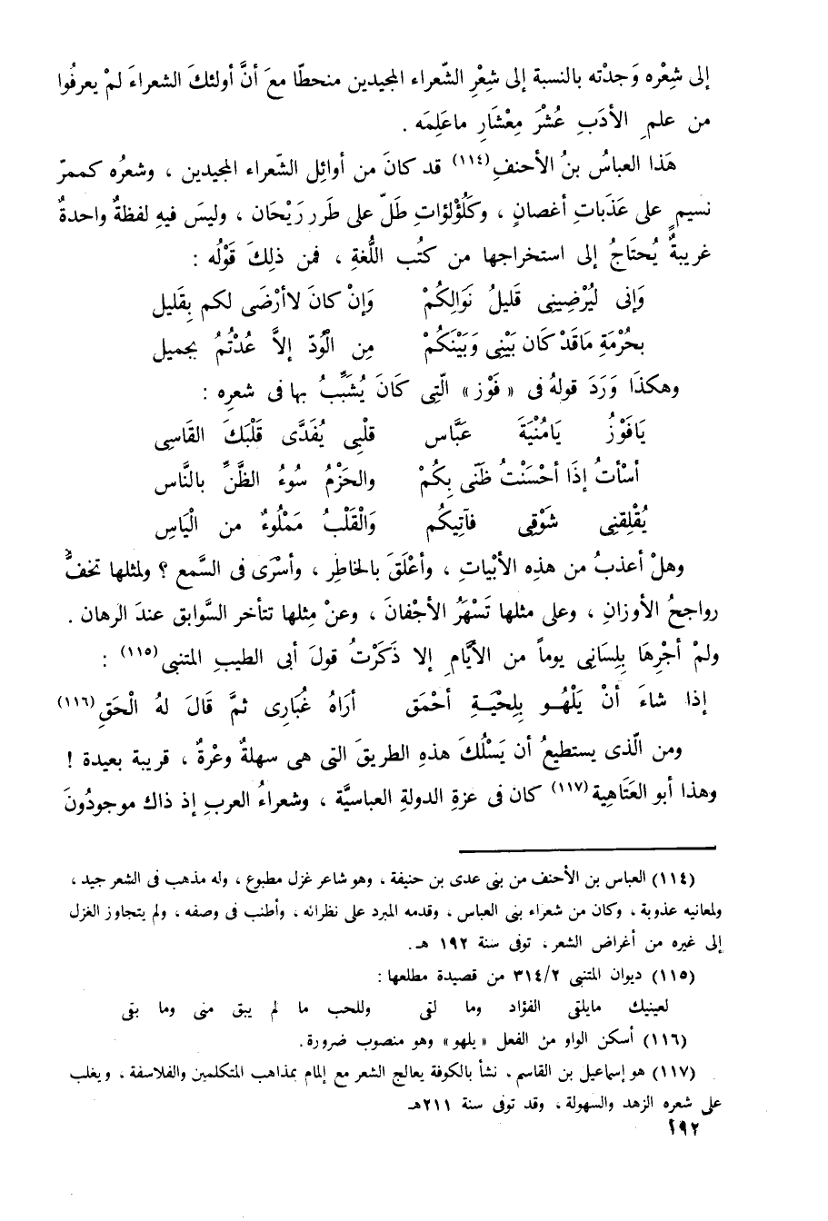 ومن الذي يستطيع أن يسلك هذه الطريق التي هي سهلة وعرة, قريبة بعيدة! وهذا أبو العتاهية4، كان في عزة الدولة العباسية، وشعراء العرب إذ ذاك موجودون