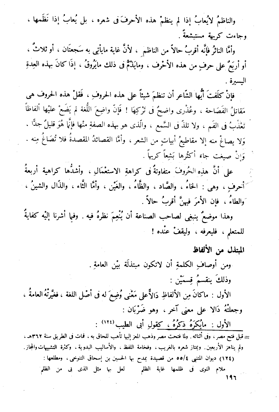 فإن كلفت أيها الشاعر أن تنظم شيئًا على هذه الحروف فقل: هذه الحروف هي مقاتل الفصاحة، وعذري واضح في تركها، فإن واضع اللغة لم يضع عليها ألفاظًا تعذب في الفم، ولا تلذ في السمع, والذي هو بهذه الصفة منها فإنما هو قليل جدًّا، ولا يصاغ منه إلّا مقاطيع أبيات من الشعر، وأما القصائد المقصَّدة فلا تصاغ منه، وإن صيغت جاء أكثرها بشعًا كريهًا.
