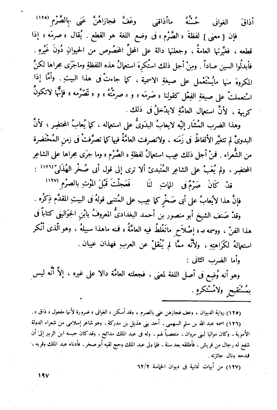 وهذا الضرب المشار إٍليه لا يعاب البدوي على استعماله، كما يعاب المحتضر؛ لأنَّ البدوي لم تتغير الألفاظ في زمنه، ولا تصرَّفت العامَّة فيها كما تصرَّفت في زمن المحتضرة من الشعراء، فمن أجل ذلك عيب استعمال لفظة "الصرم" وما جرى مجراها على الشاعر المحتضر، ولم يعب على الشاعر المبتدئ، ألا ترى إلى قول أبي صخر الهذلي2: