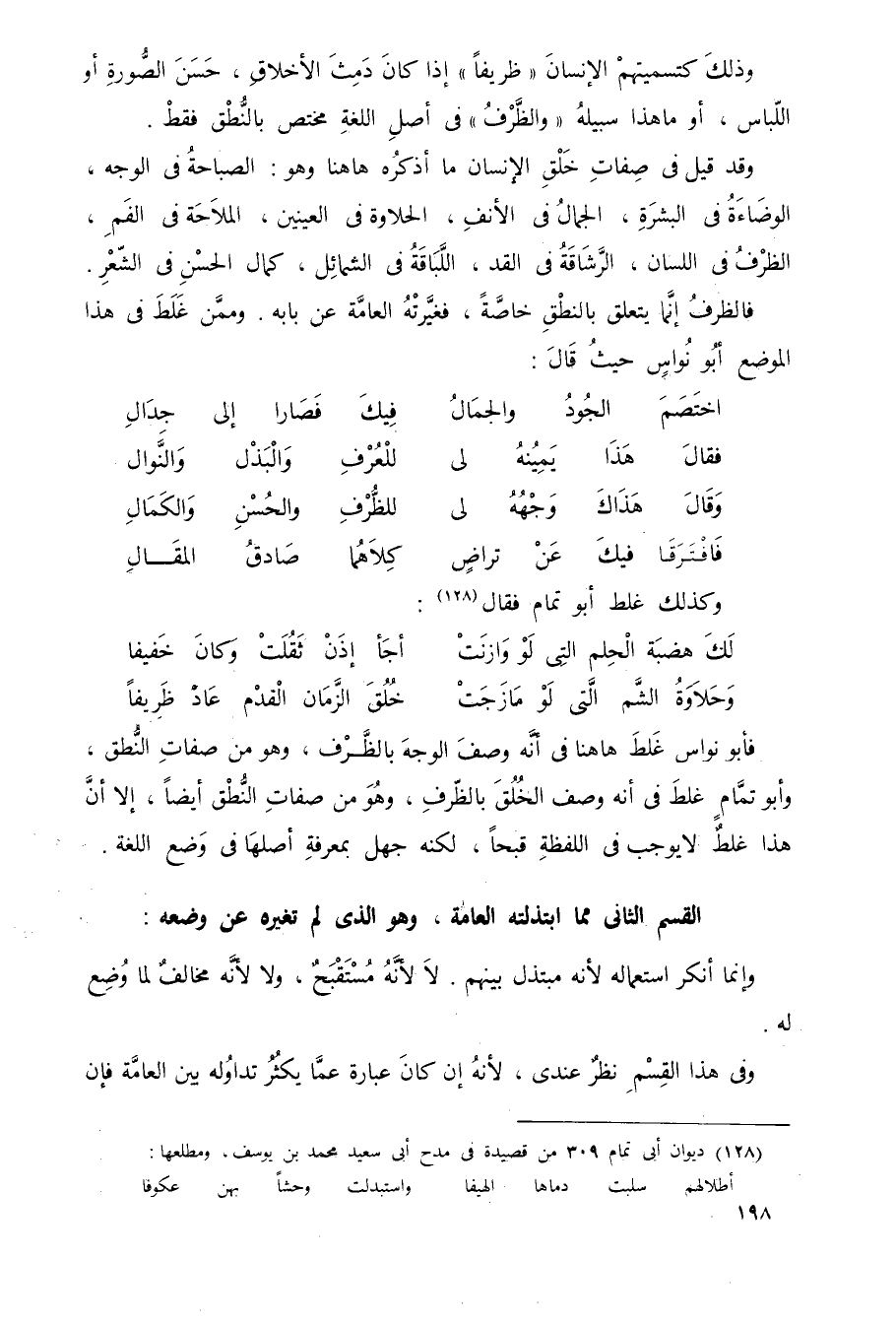 فأبو نواس غلط ههنا في أنَّه وصف الوجه بالظرف، وهو من صفات النطق، وأبو تمام غلط في أنه وصف الخلق بالظرف، وهو من صفات النطق أيضًا، إلّا أنَّ هذا غلط لا يوجب في هذه اللفظة قبحًا، لكنه جهل بمعرفة أصلها في وضع اللغة.