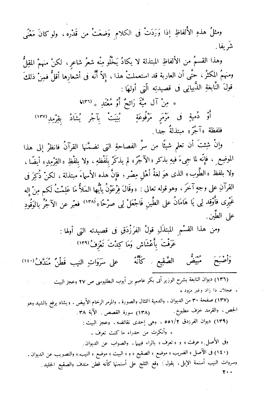 وإن شئت أن تعلم شيئًا من سر الفصاحة التي تضمّنها القرآن فانظر إلى هذا الموضوع، فإنه لما جيء فيه بذكر "الآجر" لم يذكر بلفظه، ولا بلفظ "القرمد" أيضًا، ولا بلفظ "الطوب" الذي هو لغة أهل مصر؛ فإن هذه الأسماء مبتذلة، لكن ذكر في القرآن على وجه آخر وهو قوله تعالى: {وَقَالَ فِرْعَوْنُ يَا أَيُّهَا الْمَلَأُ مَا عَلِمْتُ لَكُمْ مِنْ إِلَهٍ غَيْرِي فَأَوْقِدْ لِي يَا هَامَانُ عَلَى الطِّينِ فَاجْعَلْ لِي صَرْحًا} 3 فعبَّر عن الآجر بالوقود على الطين.