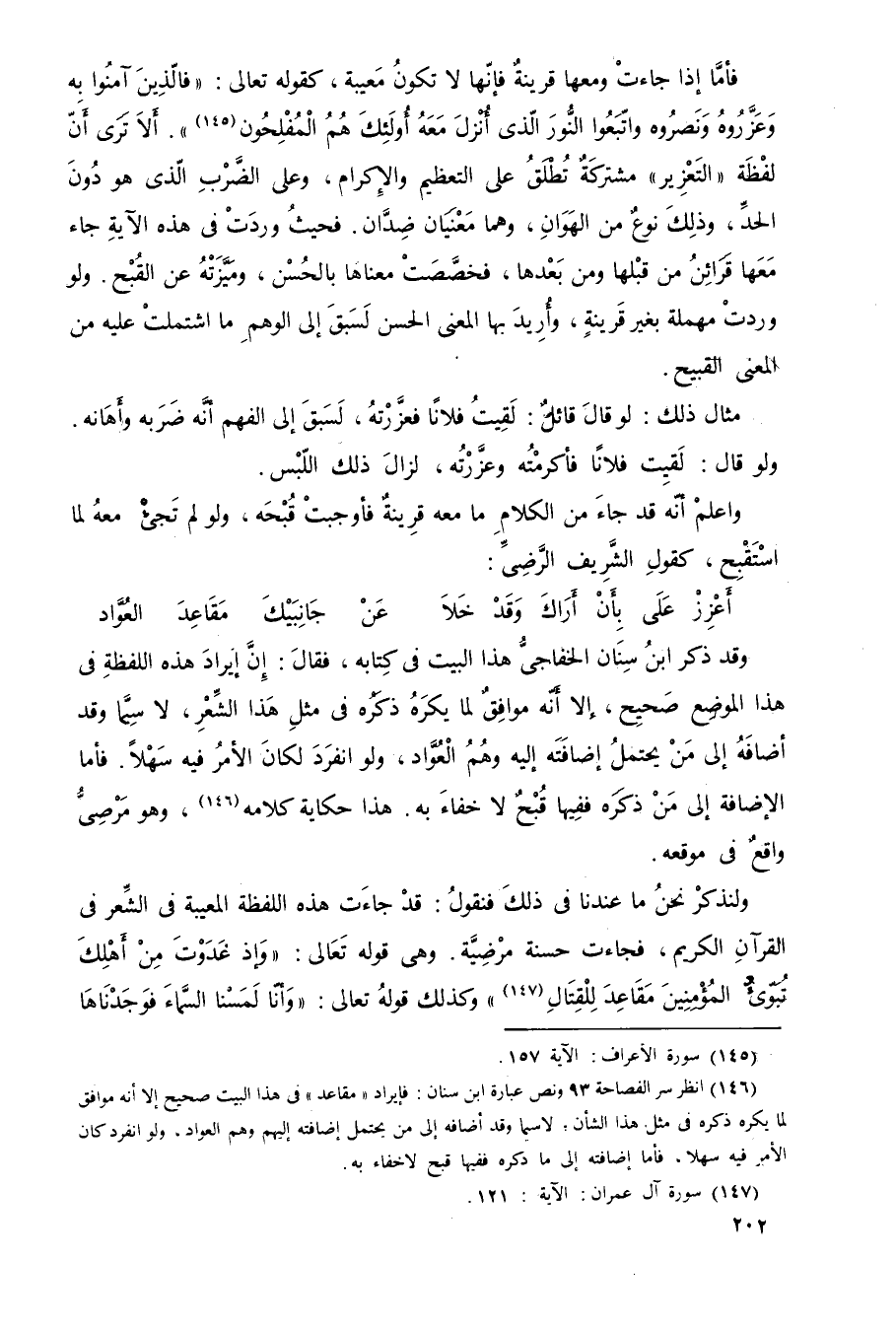 2 انظر سر الفصاحة 93, ونصّ عبارة ابن سنان: فإيراد "مقاعد" في هذا البيت صحيح, إلّا أنه موافق لما يكره ذكره في مثل هذا الشأن، لا سيما وقد أضافه إلى من يحتمل إضافته إليهم وهو العوّاد، ولو انفرد كان الأمر فيه سهلًَا، فأمَّا إضافته إلى ما ذكره ففيها قبح لا خفاء به.