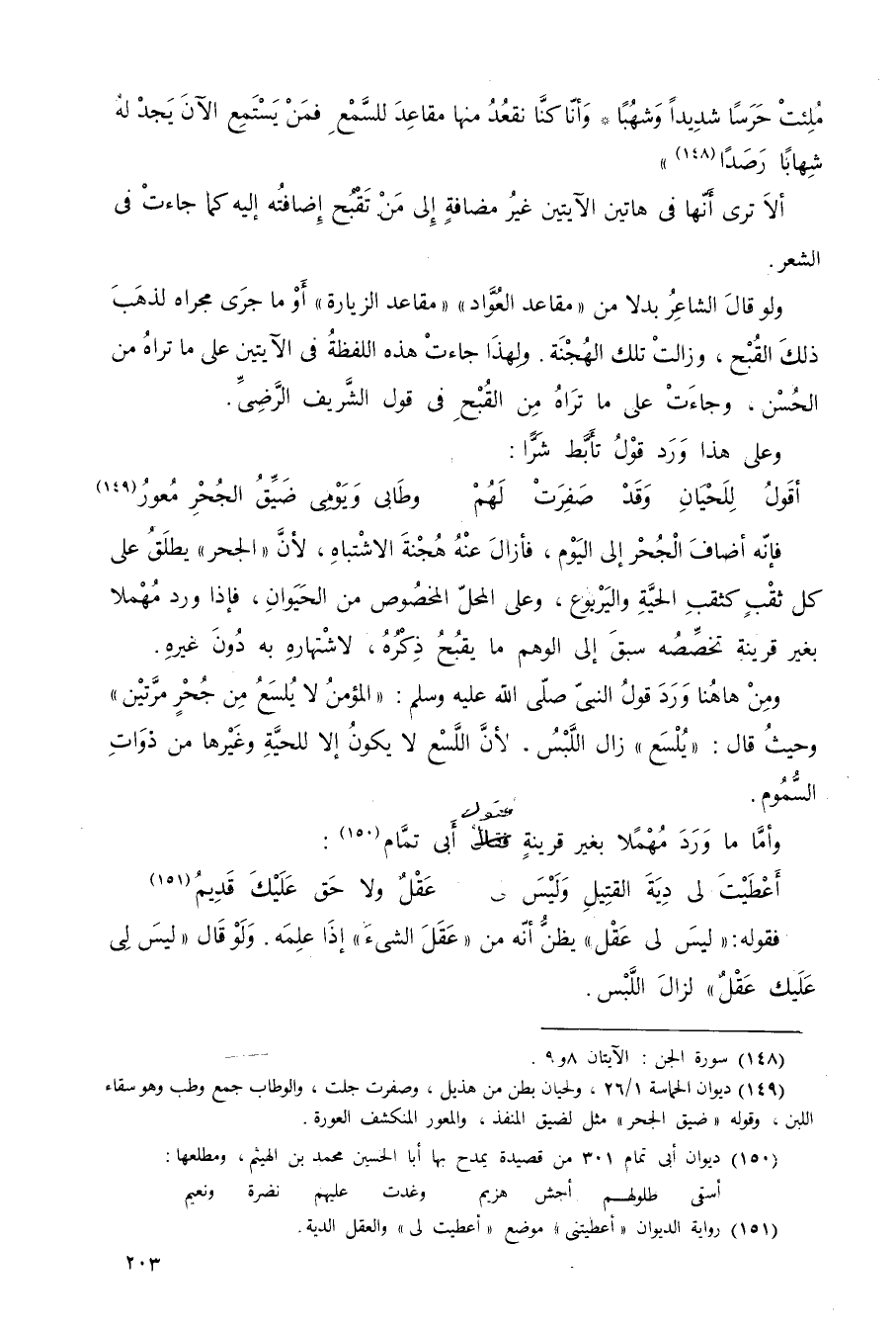 ولو قال الشاعر بدلًا من "مقاعد العواد" "مقاعد الزيارة"، أو ما جرى مجراه، لذهب ذلك القبح، وزالت تلك الهجنة، ولهذا جاءت هذه اللفظة في الآيتين على ما تراه من الحسن، وجاءت على ما تراه من القبح في قول الشريف الرضي.