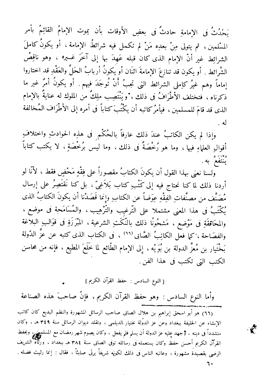 وأما النوع الخامس: وهو معرفة الأحكام السلطانية من الإمامة والإمارة والقضاء والحسبة وغير ذلك، فإنما أوجبنا معرفتها والإحاطة بها لما يحتاج إليه الكاتب في تقليدات الملوك والأمراء والقضاة والمحتسبين, ومن يجري مجراهم، وأيضًا فإنه قد يحدث في الإمامة حادث في بعض الأوقات: بأن يموت الإمام القائم بأمر المسلمين، ثم يتولَّى من بعده من لم تكمل فيه شرائط الإمامة، أو يكون كامل الشرائط غير أن الإمام الذي كان قبله عهد بها إلى آخر غيره, وهو ناقص الشرائط، أو يكون قد تنازع الإمامة اثنان، أو يكون أرباب الحل والعقد قد اختاروا إمامًا وهم غير كاملي الشرائط التي تجب أن توجد فيهم، أو يكون أمر غير ما ذكرناه، فتختلف الأطراف في ذلك، وينتصب ملك من الملوك له عناية بالإمام الذي قد قام للمسلمين، فيأمر كاتبه أن يكتب كتابًا في أمره إلى الأطراف المخالفة له.
