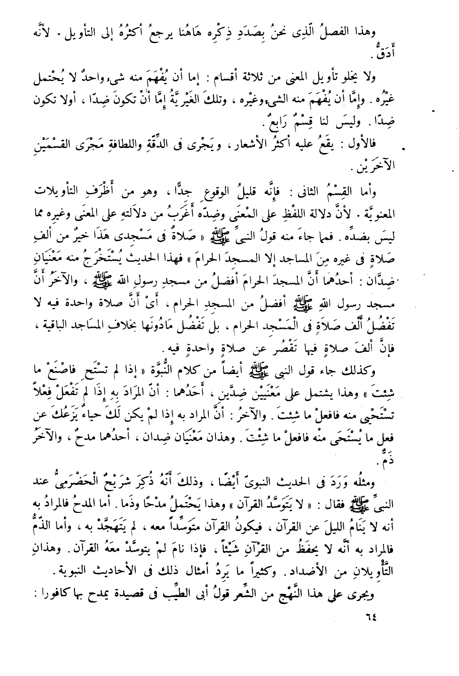 ولا يخلو تأويل المعنى من ثلاثة أقسام: إما أن يفهم منه شيء واحد لا يحتمل غيره، وإما أن يفهم منه الشيء وغيره، وتلك الغيرية: إمَّا أن تكون ضدًّا، أو لا تكون ضدًّا، وليس لنا قسم رابع.