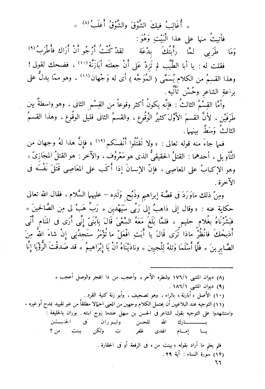 فقلت له: يا أبا الطيب، لم تزد على أن جعلته أبا زنَّة3، فضحك لقولي! وهذا القسم من الكلام يسمَّى "الموجَّه" أي: له وجهان4، وهو مما يدل على براعة الشاعر وحسن تَأَتِّيه.