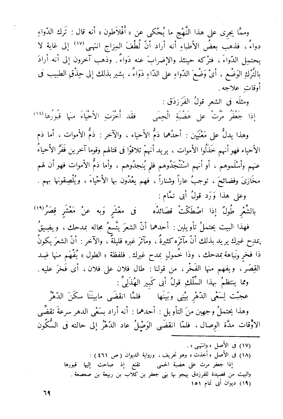 ومما يجري على هذا النهج ما يُحْكى عن "أفلاطون" أنه قال: ترك الدواء دواء، فذهب بعض الأطباء أنه أراد أنَّ لُطْفَ المزاج انتهى1 إلى غاية لا يحتمل الدواء، فتركه حينئذ والإضراب عنه دواء، وذهب آخرون إلى أنه أراد بالترك الوضع, أي: وضع الدواء على الداء دواء، يشير بذلك إلى حذق الطبيب في أوقات علاجه.