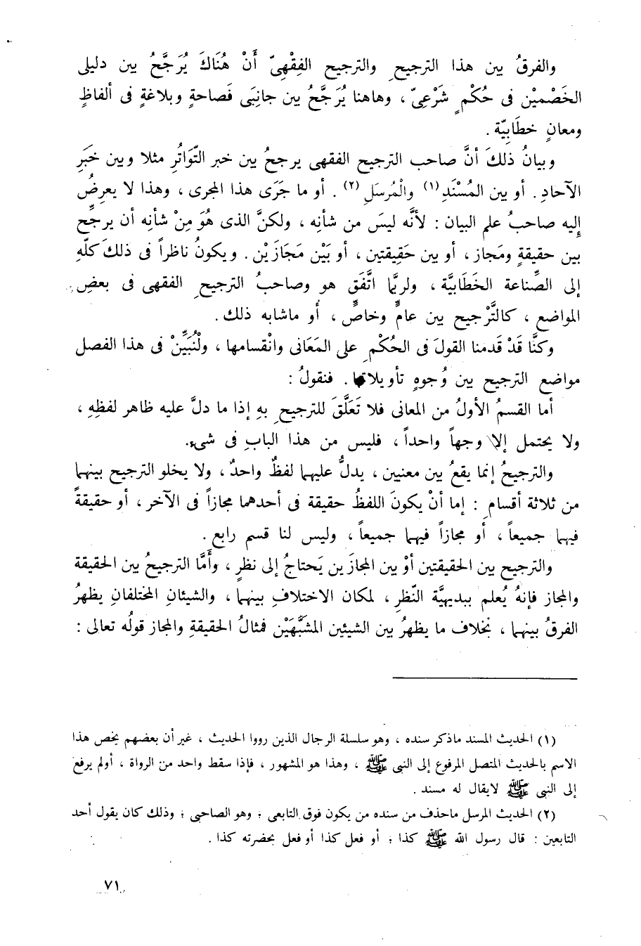 وبيان ذلك أنَّ صاحب الترجيح الفقهي يرجع بين خبر التواتر مثلًا وبين خبر الآحاد، أو بين المسند1 والمرسل2، أو ما جرى هذا المجرى، وهذا لا يعرض إليه صاحب علم البيان؛ لأنه ليس من شأنه، ولكن الذي هو من شأنه أن يرجِّح بين حقيقة ومجاز، أو بين حقيقتين، أو بين مجازين، ويكون ناظرًا في ذلك كله إلى الصناعة الخطابية، ولربما اتفق هو وصاحب الترجيح الفقهي في بعض المواضع، كالترجيح بين عام وخاص، أو ما شابه ذلك.