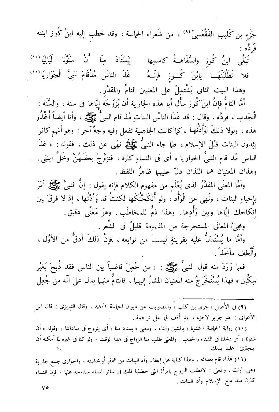1 في الأصل "جري بن كلب" والتصويب عن ديوان الحماسة 1/ 88، وقال التبريزي: قال ابن الأعرابي: وهو جرير لا جزء، ولم أقف لها على ترجمة.