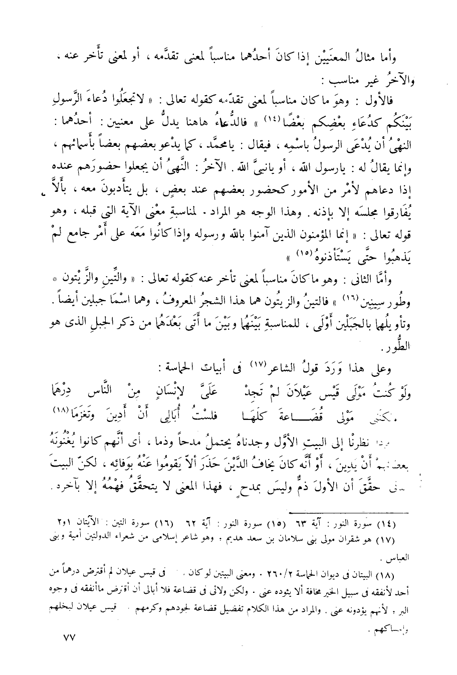 أما الثاني: وهو ما كان مناسبًا لمعنى تأخَّر عنه كقوله تعالى: {وَالتِّينِ وَالزَّيْتُونِ، وَطُورِ سِينِينَ} 3 فالتين والزيتون هما هذا الشجر المعروف، وهما اسما جبلين أيضًا، وتأويلهما بالجبلين أولى، للمناسبة بينهما وبين ما أتى بعدهما من ذكر الجبل الذي هو الطور.