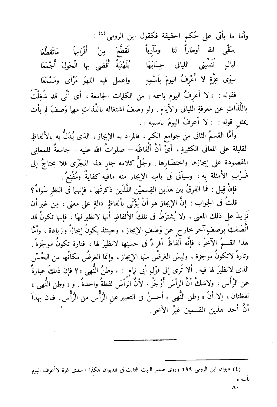 فإن قيل: فما الفرق بين هذين القسمين اللذين ذكرتهما، فإنهما في النظر سواء? قلت في الجواب: إن الإيجاز هو أن يؤتى بألفاظ دالَّة على معنى من غير أن تزيد على ذلك المعنى، ولا يشترط في تلك الألفاظ أنها لا نظير لها، فإنها تكون قد اتصفت بوصف آخر خارج عن وصف الإيجاز، وحينئذ يكون إيجازًا وزيادة. وأمَّا هذا القسم الآخر فإنه ألفاظ أفراد في حسنها لا نظير لها، فتارة تكون موجزة، وتارة لا تكون موجزة، وليس الغرض منها الإيجاز، وإنما الغرض مكانها من الحسن الذي لا نظير لها فيه، ألا ترى إلى قول أبي تمام "وطن النهي"؟ فإن ذلك عبارة عن الرأس، ولا شكَّ أن الرأس أوجز، لأن الرأس لفظة واحدة، و"وطن النهي" لفظتان، إلّا أن "وطن النهي" أحسن في التعبير عن الرأس من الرأس, فبان بهذا أن أحد هذين القسمين غير الآخر.