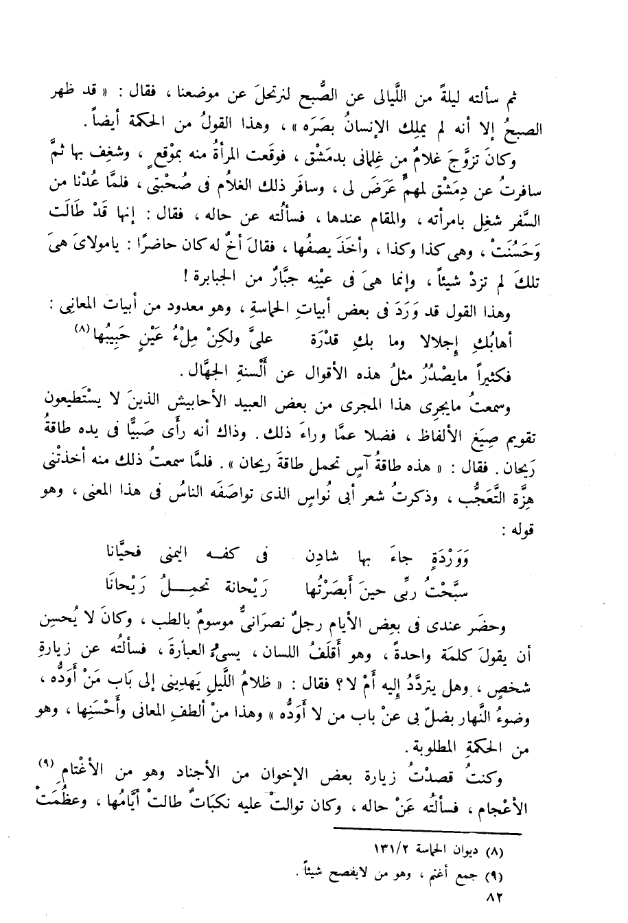 وحضر عندي في بعض الأيام رجل نصراني موسوم بالطب، وكان لا يحسن أن يقول كلمة واحدة، وهو أقلف اللسان، يسيء العبارة, فسألته عن زيارة شخص وهل يتردد إليه أم لا، فقال: "ظلام الليل يهديني إلى باب من أوده، وضوء النهار يضل به عن باب من لا أوده"، وهذا من ألطف المعاني وأحسنها وهو من الحكمة المطلوبة.