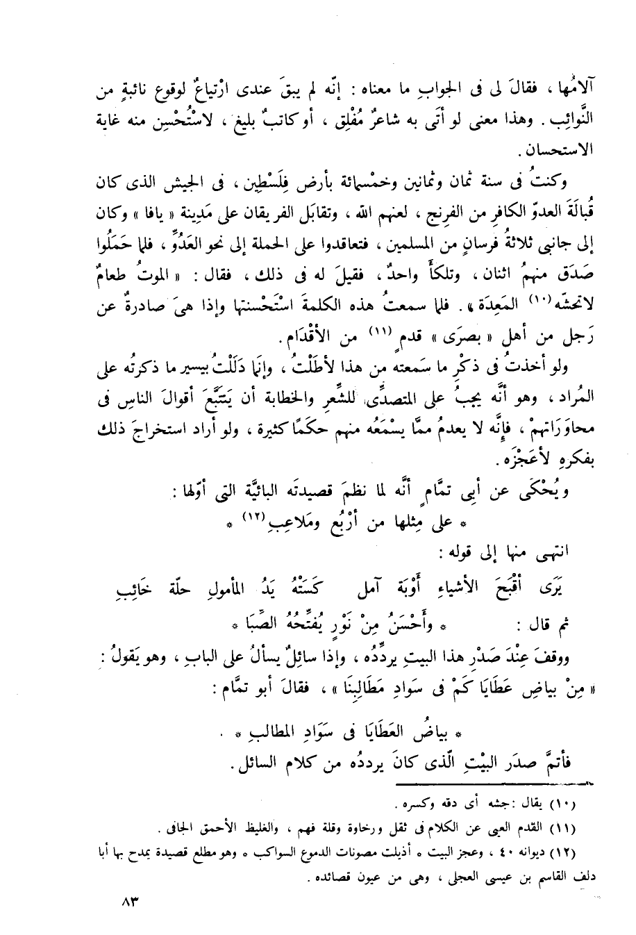 وكنت في سنة ثمان وثمانين وخمسمائة بأرض فلسطين في الجيش الذي كان قبالة العدو الكافر من الفرنج -لعنهم الله، وتقابل الفريقان على مدينة يافا، وكان إلى جانبي ثلاثة فرسان من المسلمين، فتعاقدوا على الحملة إلى نحو العدو، فلمَّا حملوا صدق منهم اثنان وتلكأ واحد، فقيل له في ذلك، فقال: "الموت طعام لا تجشه1 المعدة". فلمَّا سمعت هذه الكلمة استحسنتها، وإذا هي صادرة عن رجل من أهل "بصرى" قدم2 من الأقدام.