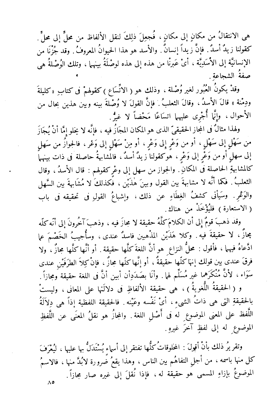 وسأجيب الخصم عمَّا ادعاه فيهما، فأقول: محل النزاع هو أن اللغة كلها حقيقة أو أنها كلها مجاز، ولا فرق عندي بين قولك: إنها كلها حقيقة, أو إنها كلها مجاز، فإن كلا الطرفين عندي سواء؛ لأن منكرهما غير مُسَلِّمٍ لهما، وأنا بصدد أن أبين أن في اللغة حقيقة ومجازًا.