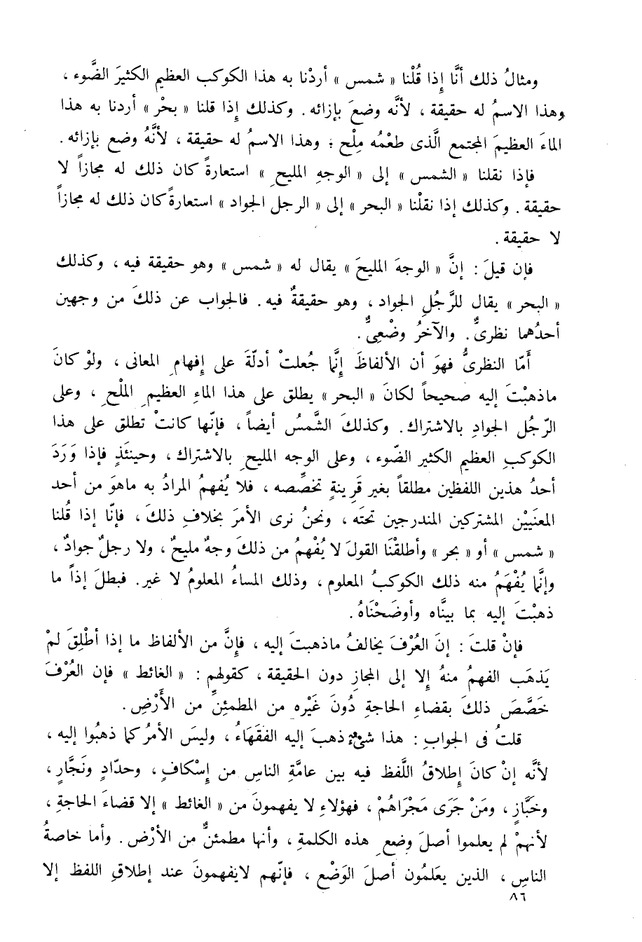 فإن قيل: إن "الوجه المليح" يقال له: "شمس"، وهو حقيقة فيه، وكذلك البحر يقال للرجل الجواد، وهو حقيقة فيه. فالجواب عن ذلك من وجهين: أحدهما نظري، والآخر: وضعي.