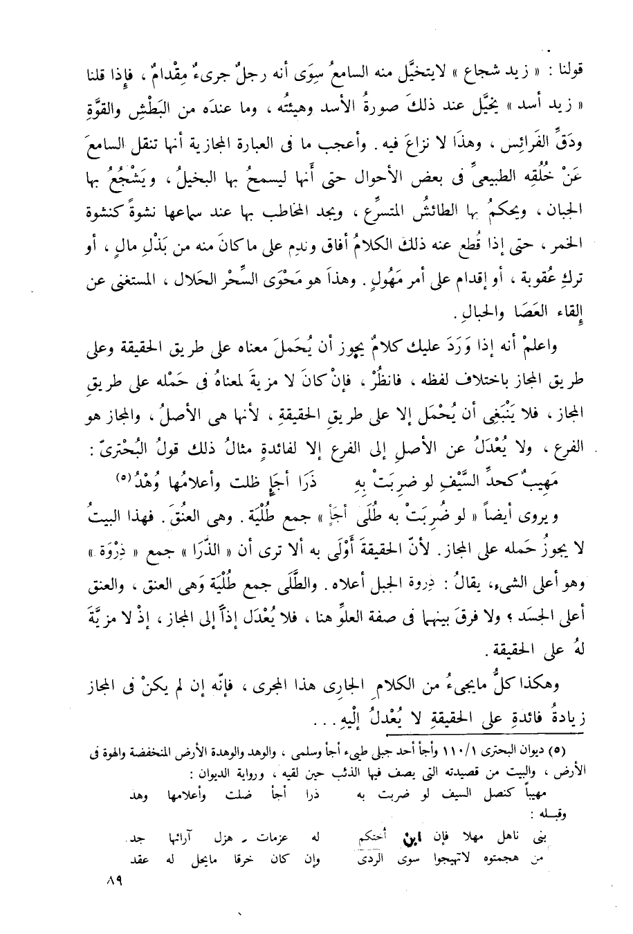واعلم أنه إذا ورد عليك كلام يجوز أن يُحْمَل معناه على طريق الحقيقة وعلى طريق المجاز باختلاف لفظه، فانظر: فإن كان لا مزية لمعناه في حمله على طريق المجاز فلا ينبغي أن يحمل إلّا على طريق الحقيقة؛ لأنها هي الأصل, والمجاز هو الفرع، ولا يعدل عن الأصل إلى الفرع إلّا لفائدة. مثال ذلك قول البحتري: