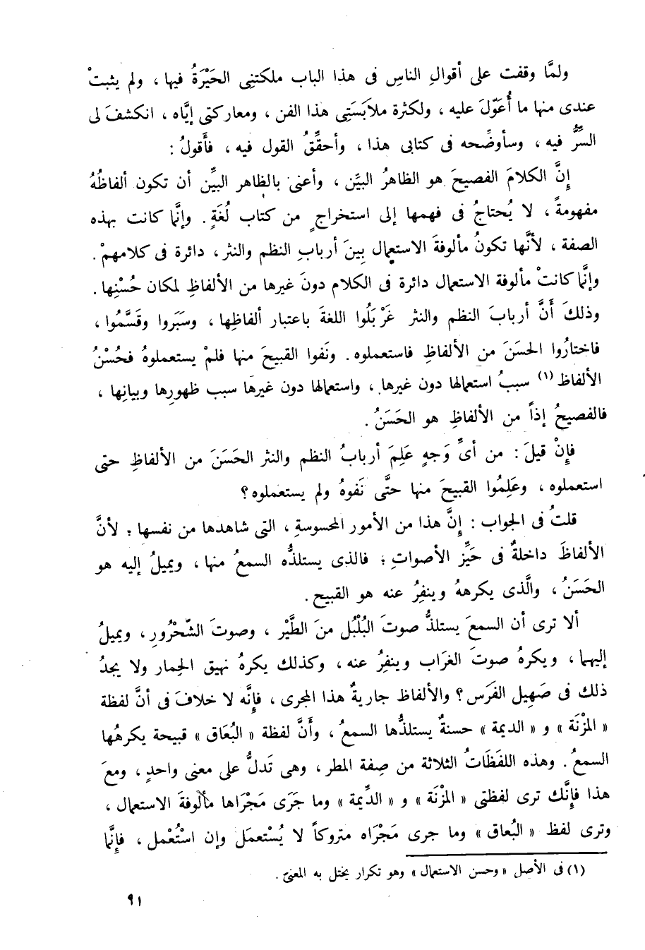 ألا ترى أن السمع يستلذّ صوت البلبل من الطير, وصوت الشحرور، ويميل إليهما، ويكره صوت الغراب، وينفر عنه، وكذلك يكره نهيق الحمار، ولا يجد ذلك في صهيل الفرس، والألفاظ جارية هذا المجرى، فإنه لا خلاف في أن لفظة "المزنة" و"الديمة" حسنةٌ يستلذها السمع، وأن لفظة "البعاق" قبيحة يكرهها السمع، وهذه اللفظات الثلاثة من صفة المطر، وهي تدل على معنى واحد، ومع هذا فإنك ترى لفظتي "المزنة" و"الديمة" وما جرى مجراهما مألوفة الاستعمال، وترى لفظ "البعاق" وما جرى مجراه متروكًا لا يستعمل، وإن استعمل، فإنما