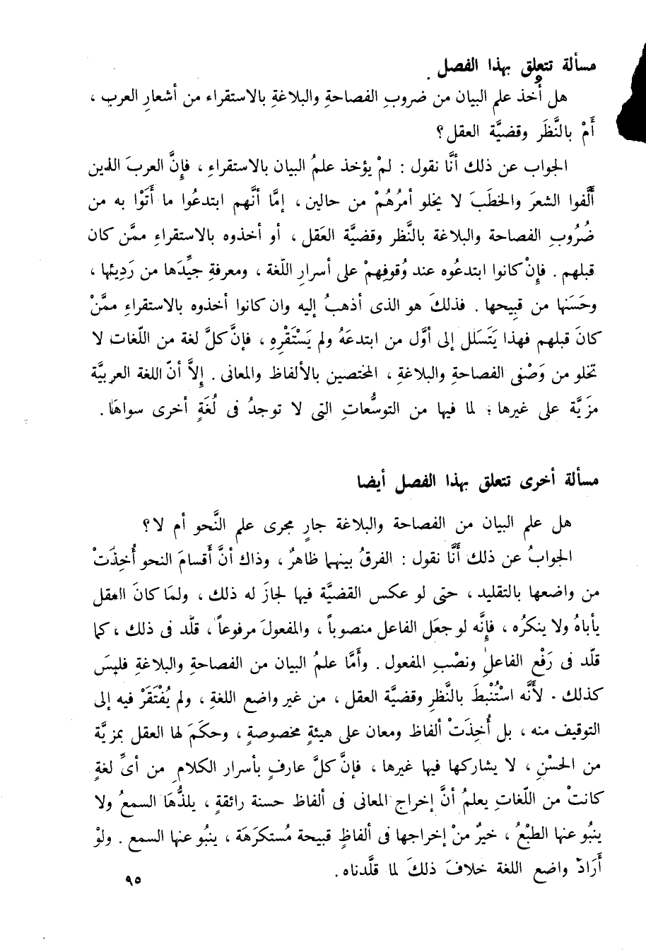 الجواب عن ذلك أنَّا نقول: لم يؤخذ علم البيان بالاستقراء، فإن العرب الذين ألَّفوا الشعر والخطب لا يخلو أمرهم من حالين: إما أنهم ابتدعوا ما أتوا به من ضروب الفصاحة والبلاغة بالنظر وقضية العقل، أو أخذوه بالاستقراء ممن كان قبلهم, فإن كانوا ابتدعوه عند وقوفهم على أسرار اللغة, ومعرفة جيدها من رديئها، وحسنها من قبيحها, فذلك هو الذي أذهب إليه. وإن كانوا أخذوه بالاستقراء ممن كان قبلهم، فهذا لا يتسلسل إلى أوّل من ابتدعه ولم يستقره، فإن كل لغة من اللغات لا تخلو من وَصْفَيْ الفصاحة والبلاغة المختصَّيْن بالألفاظ والمعاني، إلّا أن اللغة العربية مزية على غيرها، لما فيها من التوسعات التي لا توجد في لغة أخرى سواها.