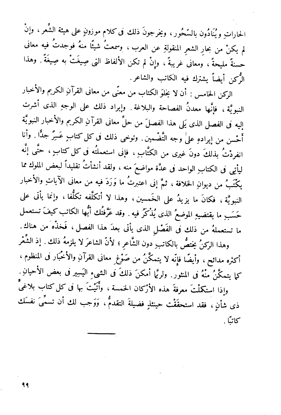 وإذا استكملت معرفة هذه الأركان الخمسة، وأتيت بها في كل كتاب بلاغي ذي شأن, فقد استحققت حينئذ فضيلة التقدم، ووجب لك أن تسمي نفسك كاتبًا.