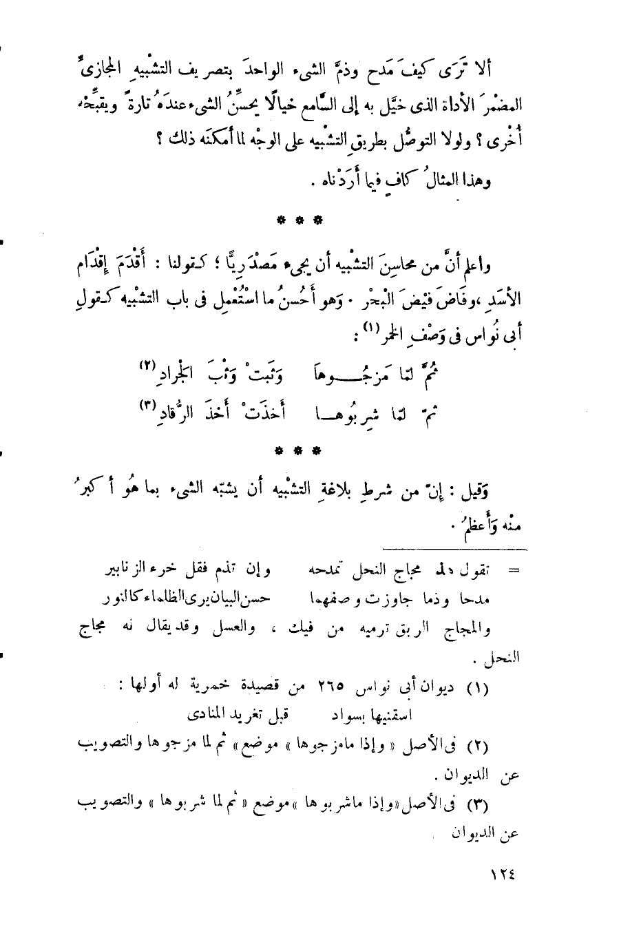 والعجب أنه يقول مثل هذا الغث الذي لا ملاءمة بينه، وبين ما شبه به، ويقرنه بالبديع الذي أحسن فيه وأبدع، وهو: