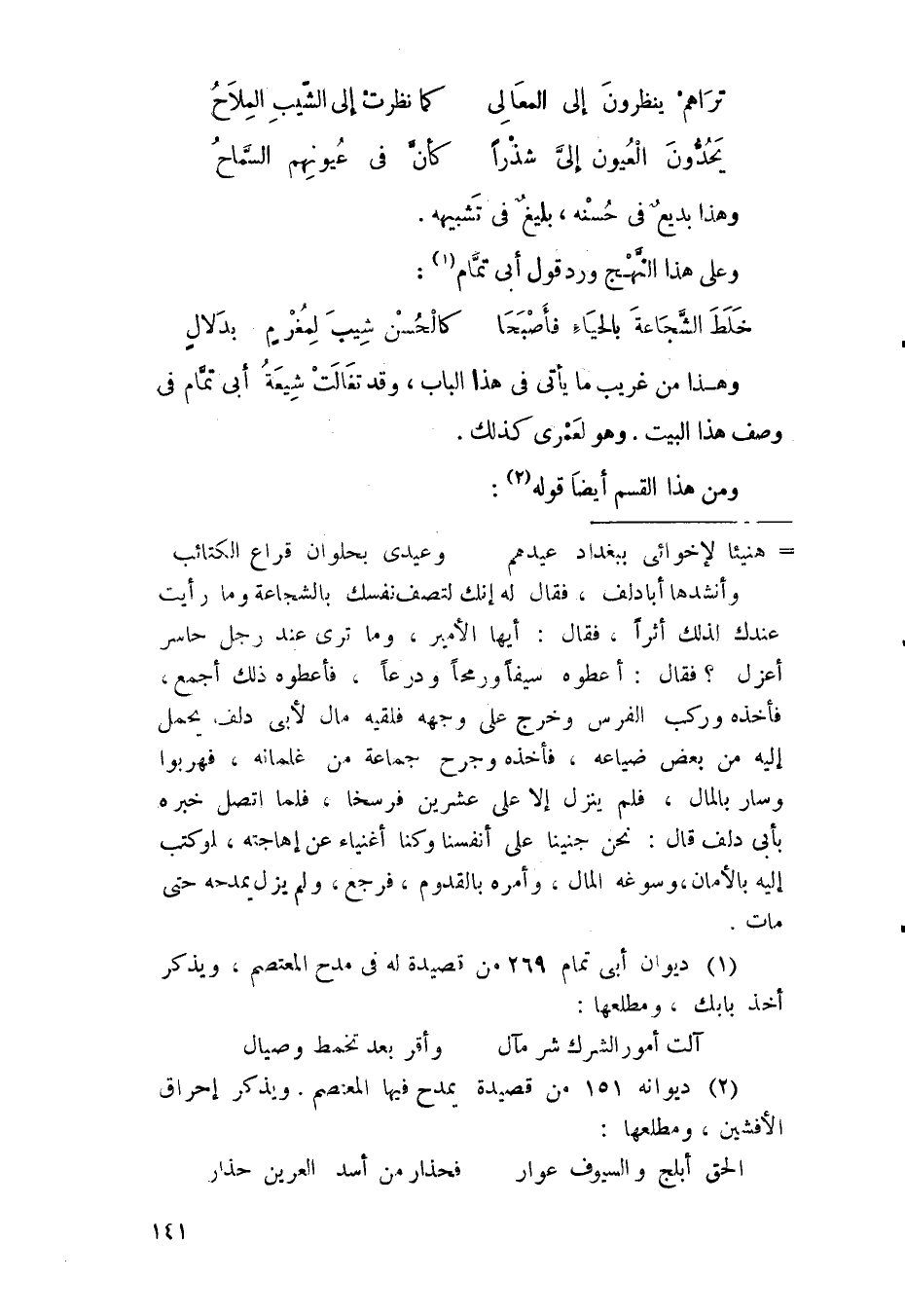 ألا ترى أنه قال في الأول: "يصرف مسراها" مخاطبة للغائب، ثم قال بعد ذلك: "إذا العيس لاقت بي" مخاطبا نفسه، وهي هذا من الفائدة أنه لما صار إلى مشافهة للممدوح، والتصريح باسمه خاطب عند ذلك نفسه مبشرًا لها بالبعد عن المكروه، والقرب من المحبوب، ثم جاء بالبيت الذي يليه معدولًا به عن خطاب نفسه إلى خطاب غيره، وهو أيضًا خطاب لحاضر، فقال: "هنالك نلقى الجود"، والفائدة بذلك أنه يخبر غيره بما شهده، كأنه يصف له جود الممدوح، وما لاقاه منه، إشادة بذكره، وتنويها باسمه، وحملا لغيره على قصده، وفي صفته جود الممدوح بتلك الصفة الغريبة البليغة، وهي قوله: "حيث قطعت تمائمه" ما يقتضي له الرجوع إلى خطاب الحاضر، والمراد بذلك أن محل الممدوح هو مألف الجود، ومنشؤه ووطنه، وقد يراد به