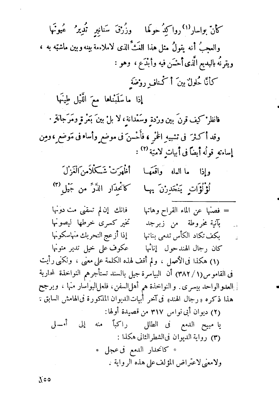 فقوله: "لا أنت أنت ولا الديار ديار" من المليح النادر في هذا الموضع؛ لأنه هو والديار الديار، وإنما البواعث التي كانت تبعث على قضاء الأوطار زالت، فبقي ذلك الرجل، وليس هو على الحقيقة، ولا الديار في عينه من الحسن تلك الديار.