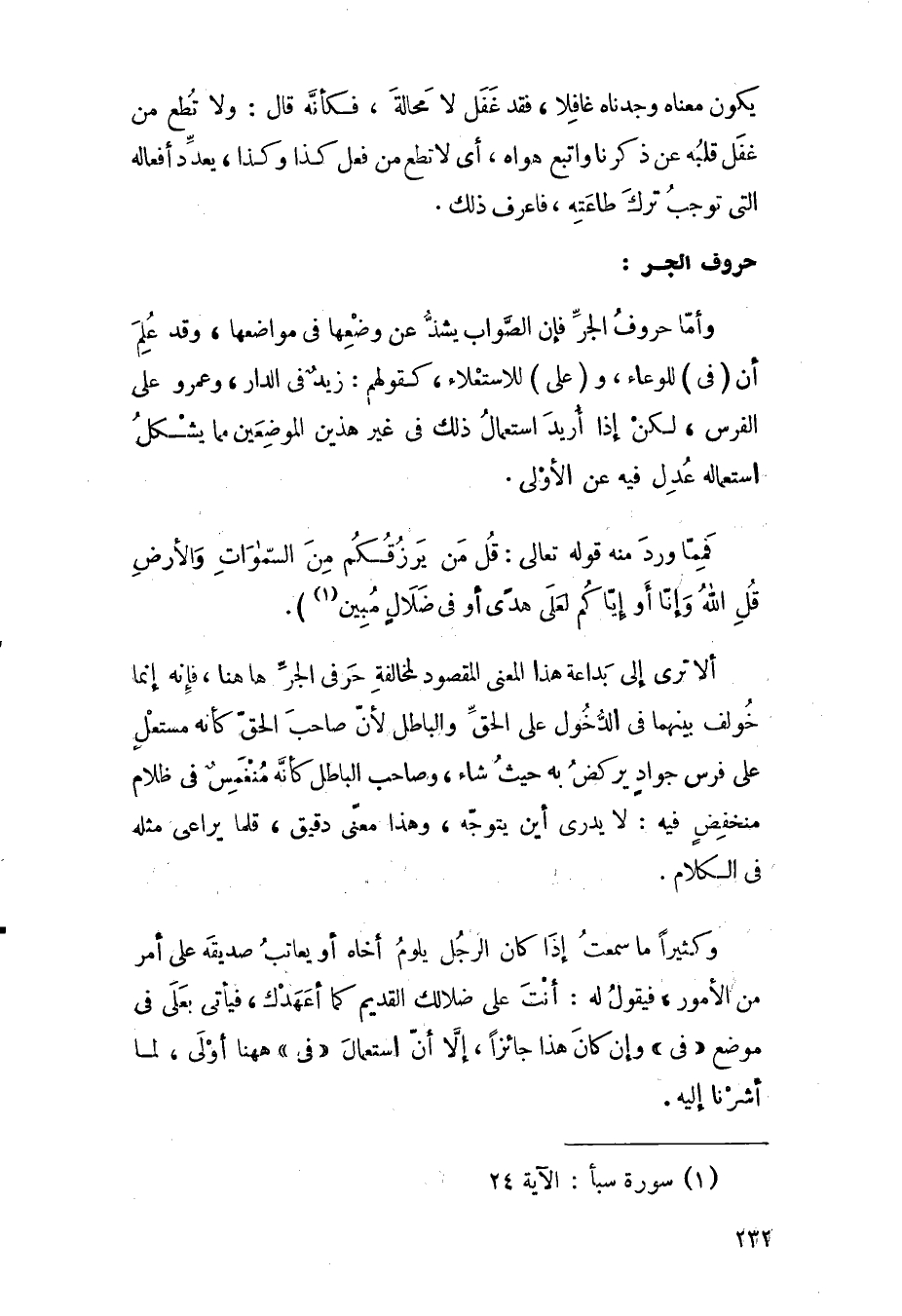 وقد نص عثمان بن جني -رحمه الله تعالى- على عدم الجواز في حذف الفاعل، وهذه الآية وهذا البيت الشعري، وهذه الكلمة الواردة عن العرب على خلاف ما ذهب إليه3.