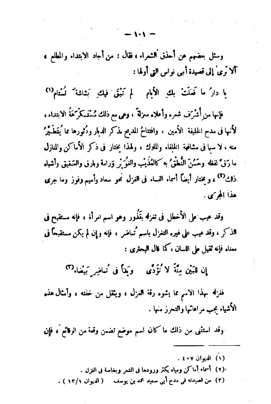 فإنها من أشرف شعره وأعلاه منزلة، وهي مع ذلك مستكرهة الابتداء؛ لأنها في مدح الخليفة الأمين، وافتتاح المديح بذكر الديار ودثورها مما يتطير منه، لا سيما في مشافهة الخلفاء والملوك, ولهذا يختار في ذكر الأماكن والمنازل ما رق لفظه وحسن النطق به، كالعذيب والغوير ورامة وبارق والعقيق، وأشباه ذلك2, ويختار أيضًا أسماء النساء في الغزل نحو: سعاد وأميم وفوز وما جرى هذا المجرى.